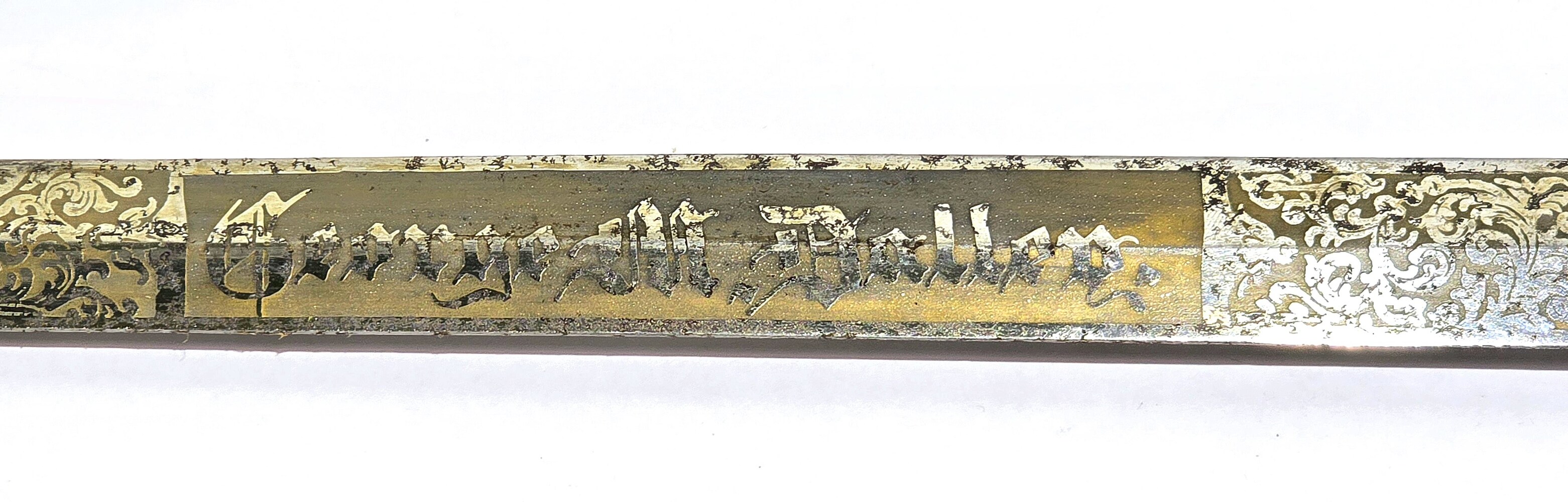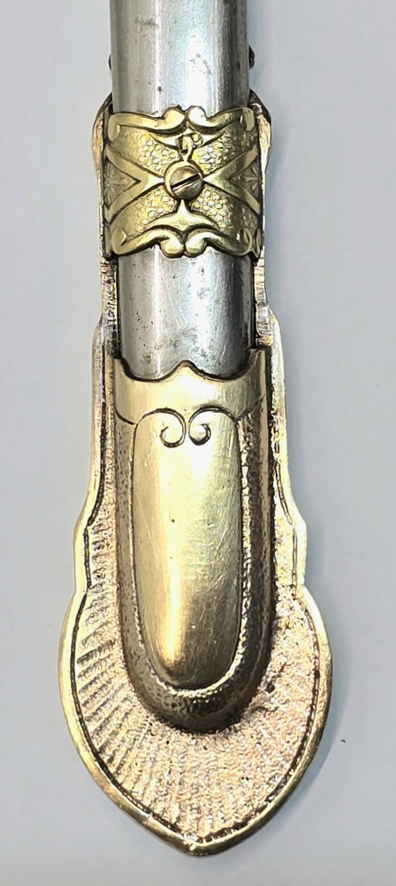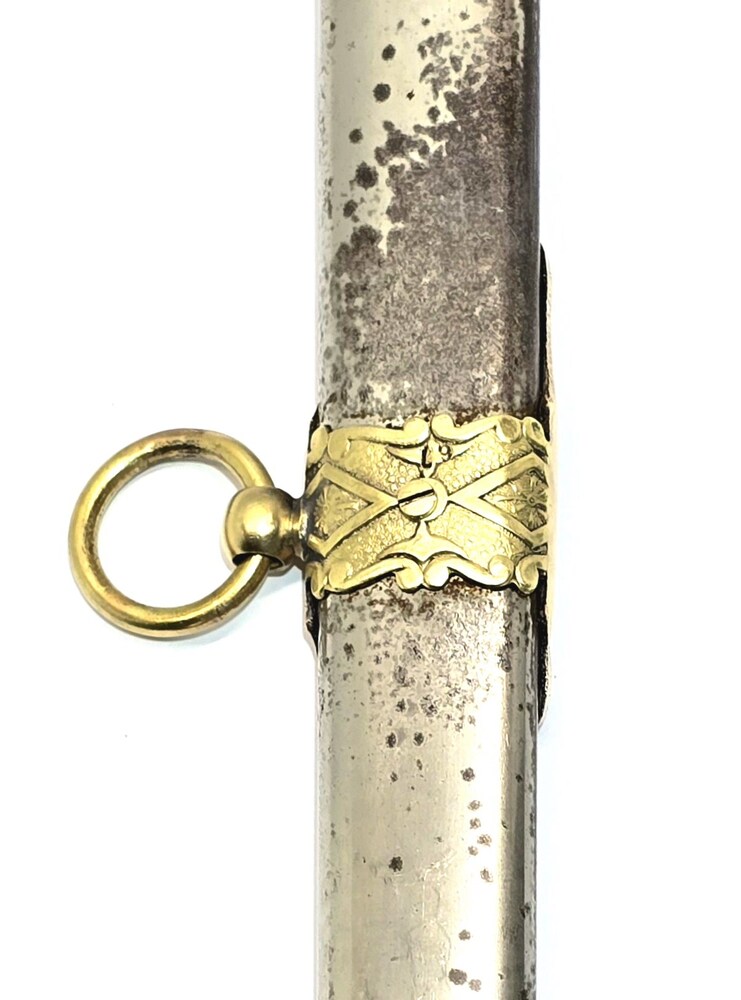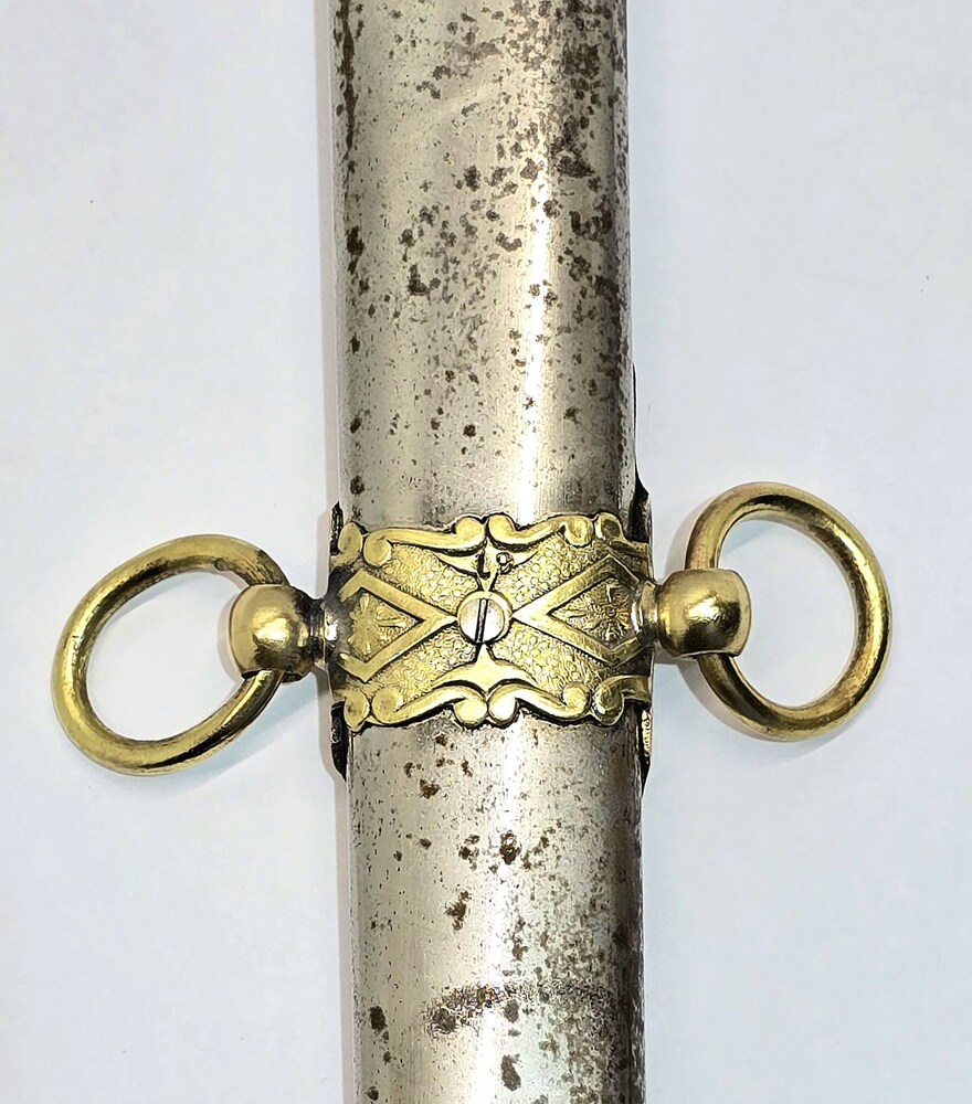 Sword Appearance: given its age, the sword is in clean condition with discoloration to blade, scabbard, and detail work. The workmanship and ornate design of the sword are easily appreciated while the discoloration and signs of aging give the piece some historical context.