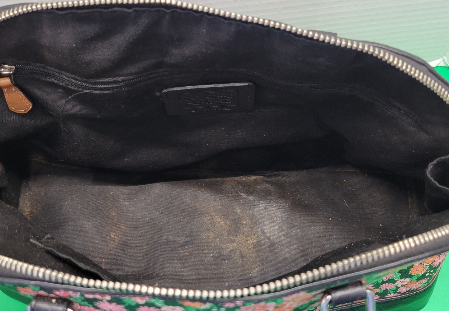 **the purse in this listing does not come with its long strap. There are some make up marks on the inside bottom lining from regular purse use and a couple of marks on the bottom of the outside of the purse.**
