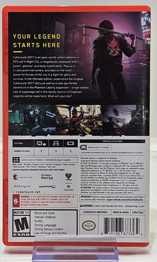 Cyberpunk 2077: Ultimate Edition for the Nintendo Switch 2 is an open-world action RPG where you play as a mercenary named V in the city of Night City. This edition includes the base game and the Phantom Liberty expansion, allowing you to experience all of Night City and its spy-thriller storyline in Dogtown. It takes advantage of the Switch 2's features, offering motion controls, a "mouse mode" for the Joy-Cons, and HD Rumble.