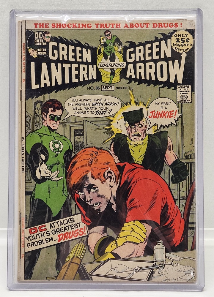 Green Lantern #85, published by DC Comics in 1971, is a landmark issue known for its candid and groundbreaking portrayal of drug addiction. Titled "Snowbirds Don't Fly," the story, written by Denny O'Neil and illustrated by Neal Adams, famously reveals that Green Arrow's sidekick, Speedy (Roy Harper), is a heroin addict. This marked a significant departure from the more sanitized themes typically found in mainstream comics at the time.