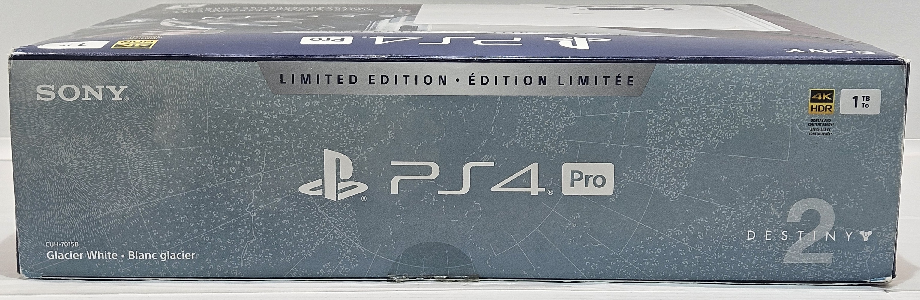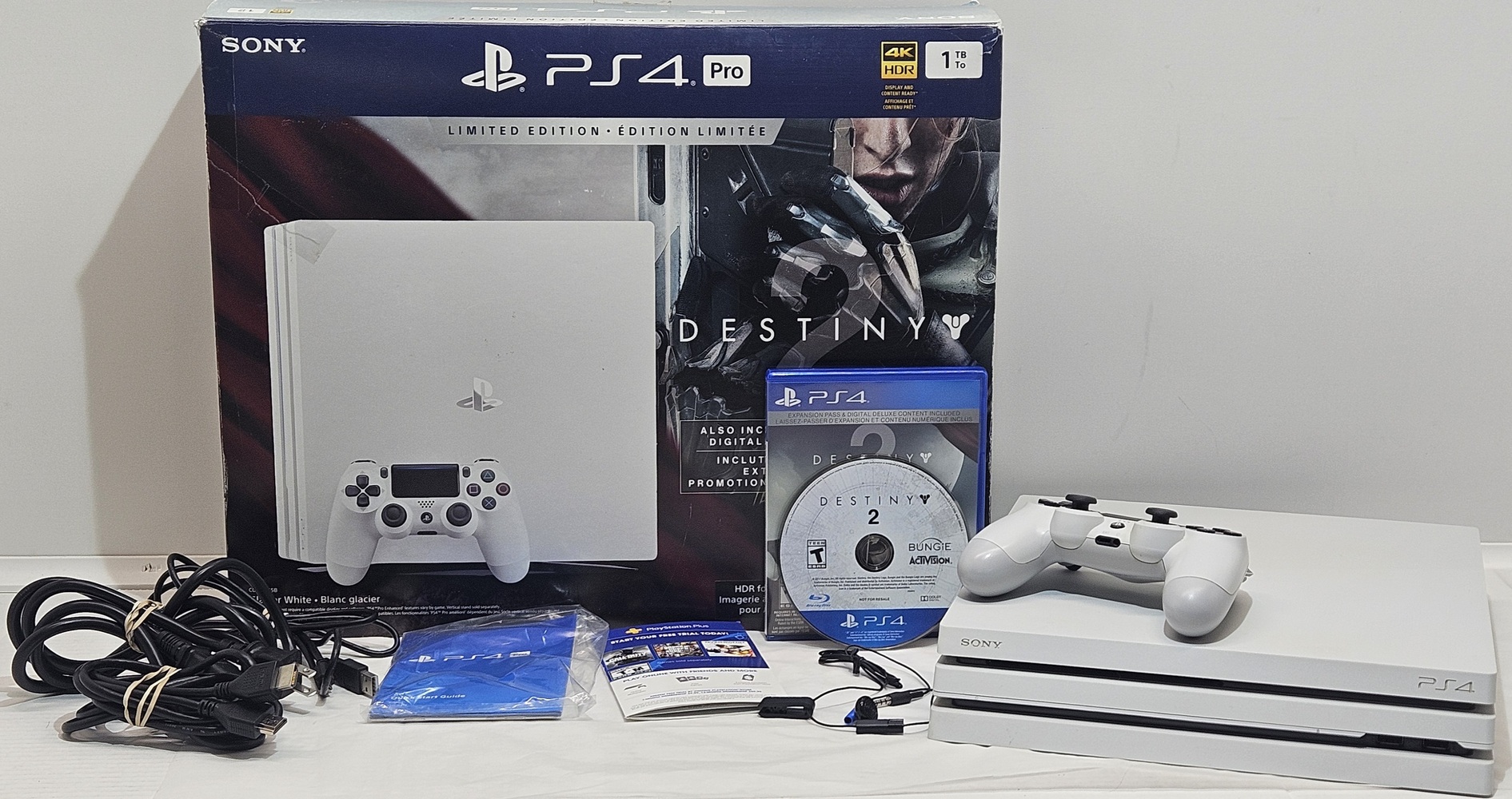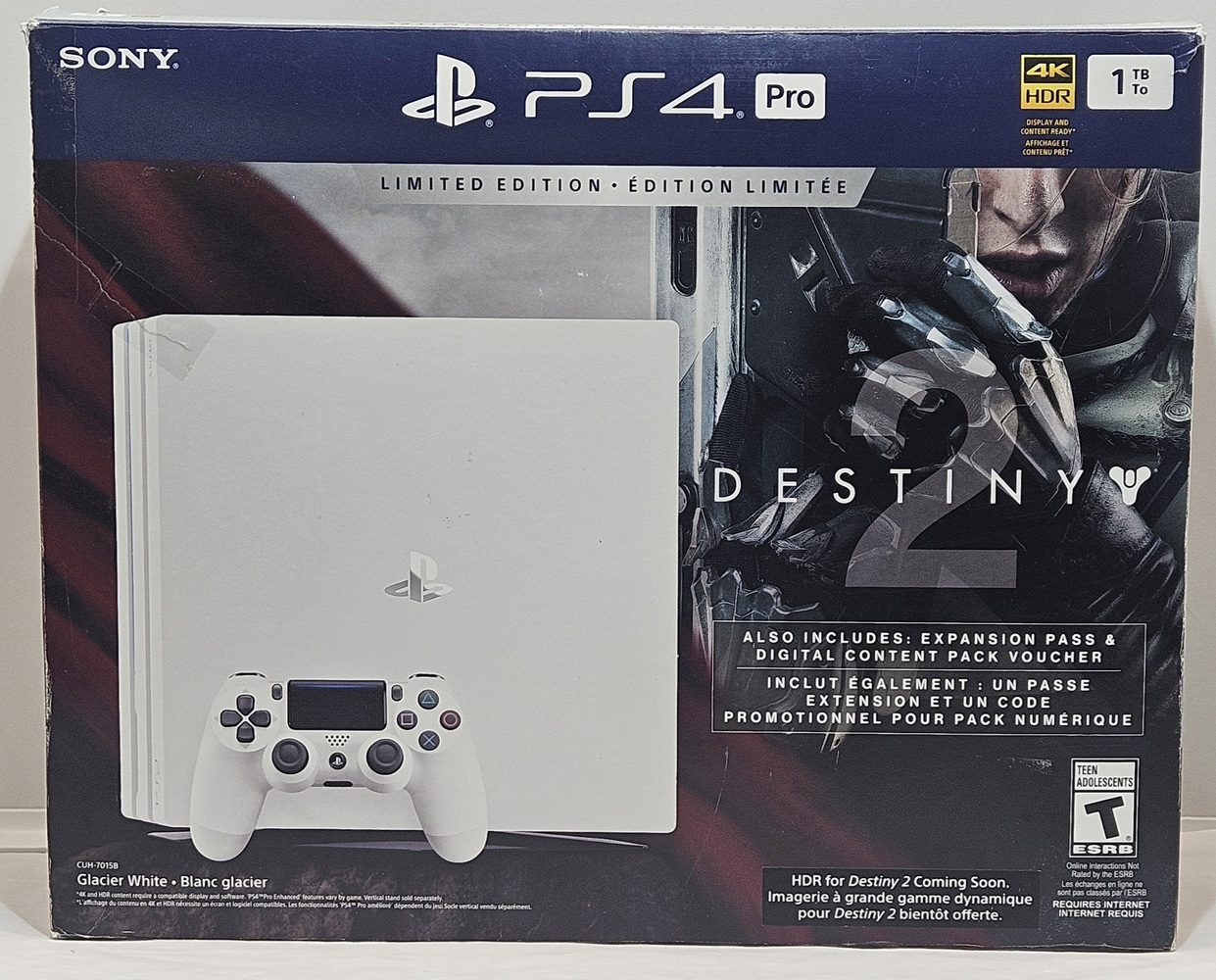 The Sony 1TB PS4 Pro Destiny 2 Edition is a limited edition console bundle that includes a "Glacier White" PS4 Pro with a 1TB hard drive, a matching white DualShock 4 controller, the Destiny 2 game, and various in-game digital content such as an Expansion Pass voucher, exclusive bonus content for PS4 players, and a unique in-game emblem. The console features dynamic 4K gaming, HDR support, and a GPU with 4.2 teraflops of processing power.