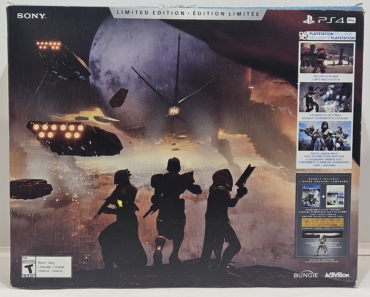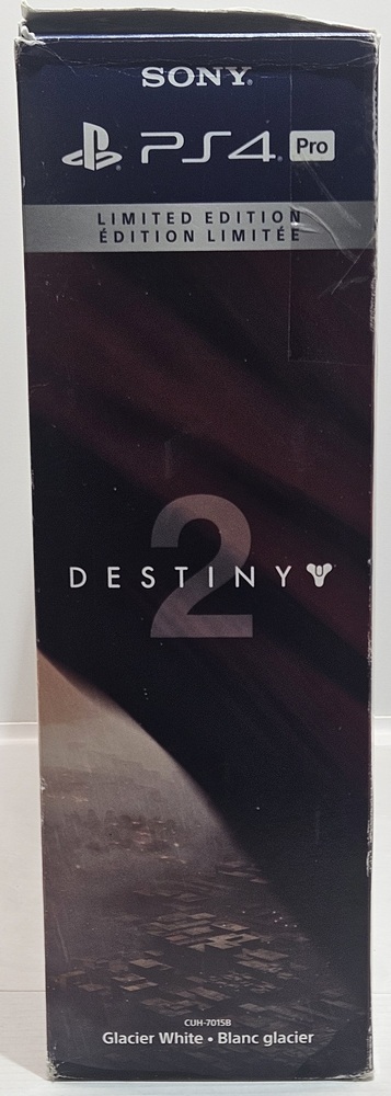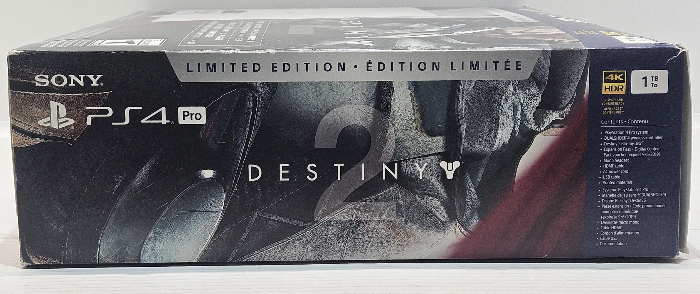 The Sony 1TB PS4 Pro Destiny 2 Edition is a limited edition console bundle that includes a "Glacier White" PS4 Pro with a 1TB hard drive, a matching white DualShock 4 controller, the Destiny 2 game, and various in-game digital content such as an Expansion Pass voucher, exclusive bonus content for PS4 players, and a unique in-game emblem. The console features dynamic 4K gaming, HDR support, and a GPU with 4.2 teraflops of processing power.