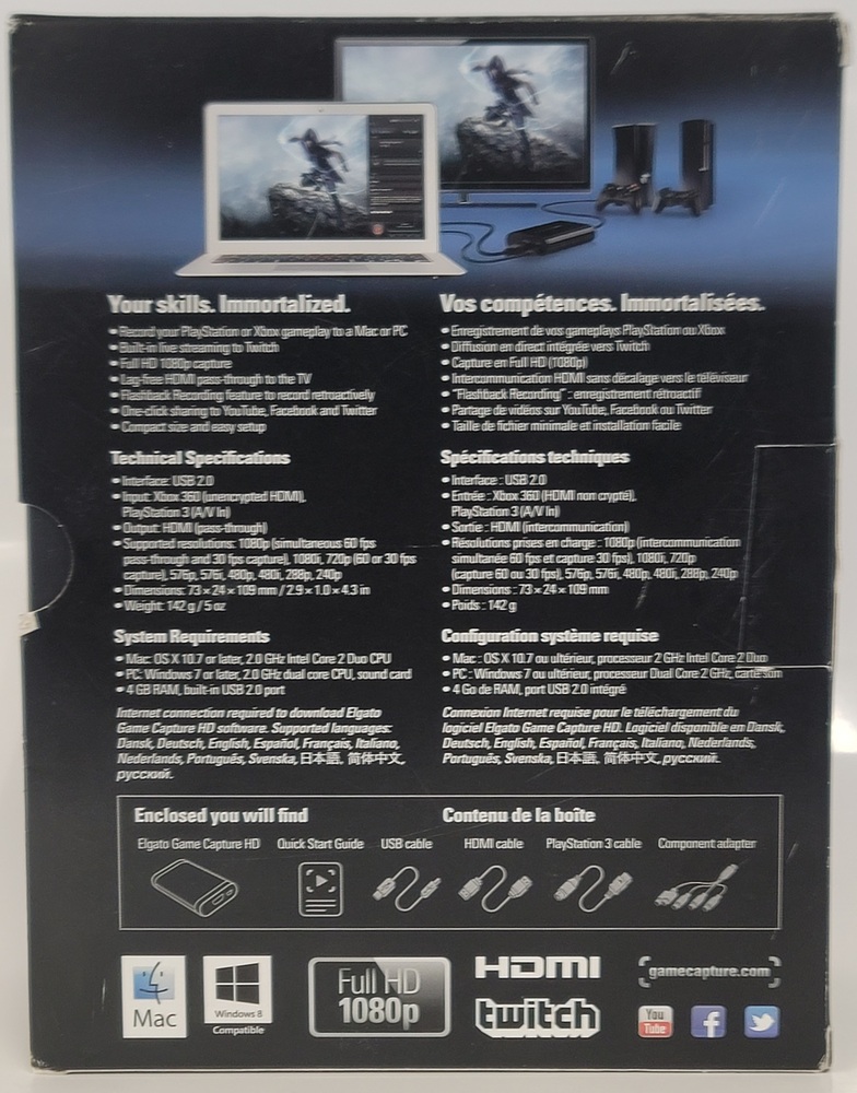 Record your Xbox or PlayStation gameplay to a Mac or PC with built-in live streaming to YouTube and Twitch. Full HD 1080p capture flashback recording feature to record retroactively immediate access and full control of your captures one-click sharing to YouTube, Facebook and Twitter. Lag-free HDMI Pass-through to the TV compact size and easy setup. Elgato Game Capture HD enables you to record and stream Xbox or PlayStation gameplay and share it with your friends and fans. With advanced hardware H.264 Encoding, you can capture in stunning 1080p full HD quality, while keeping the file size low. The gameplay is passed through to the TV via HDMI - in pristine quality, without delay. Elgato Game Capture HD doesn't need a lot of cables or even a power supply to record your game; with direct PlayStation 4, Xbox One, Xbox 360 And PlayStation 3 input. You can use a single cable to connect it to your console. The software makes it easy to capture every move you make, even if you forget to press the record button: The Unique Flashback Recording feature lets you timeshift your gameplay, so that you can simply slide back in time on your Mac or PC and hit the record button retroactively. Thanks to unlimited full HD 1080p capture, you remain in full control of your footage, directly where you need it. Even better, the tailor-made Elgato Game Capture HD software allows you to quickly trim your gaming scenes and pass them on to your favorite editing software. With one click, you can stream your gameplay To YouTube or Twitch, and share your journey with friends and fans on YouTube, Facebook and Twitter. Your skills, immortalized. The gaming experience is all about aharing. With Elgato Game Capture HD, you can record and stream your Xbox or PlayStation gameplay and share your journey with friends, fans and generations to come. Be the best.