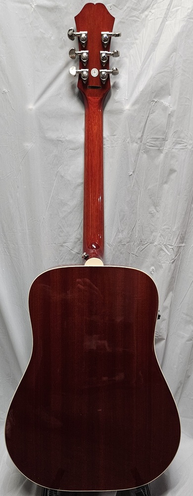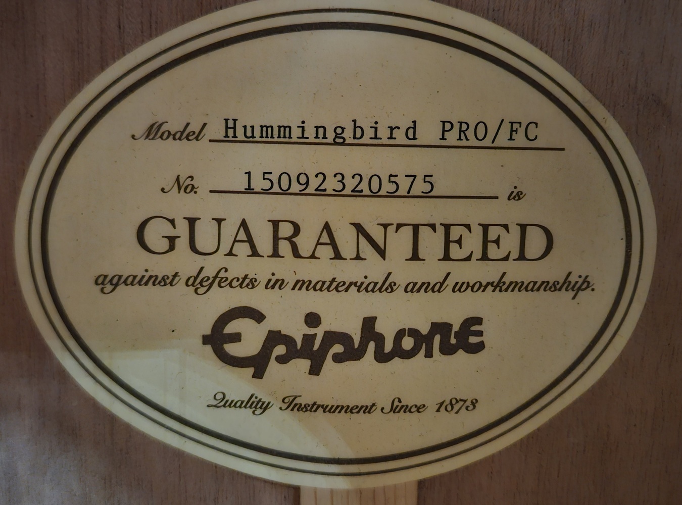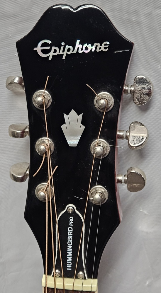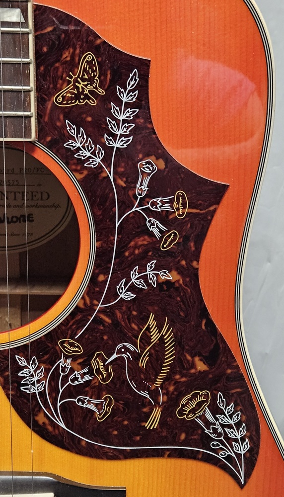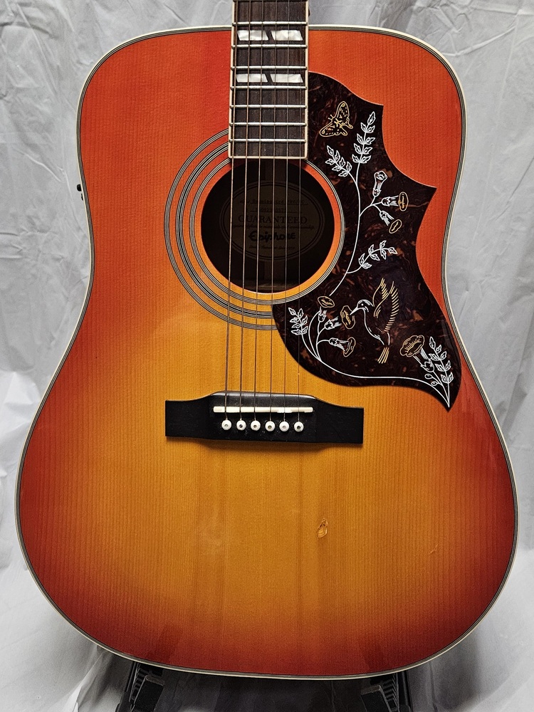 The Epiphone Hummingbird Pro is an unmistakable 6-string acoustic-electric guitar. Its distinct hummingbird pickguard and beautiful, split parallelogram inlays on the pau ferro fingerboard add an extra touch of charm.