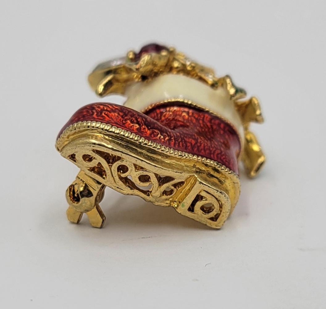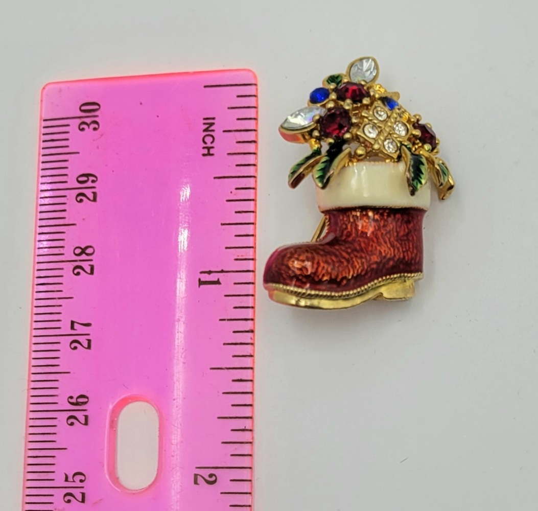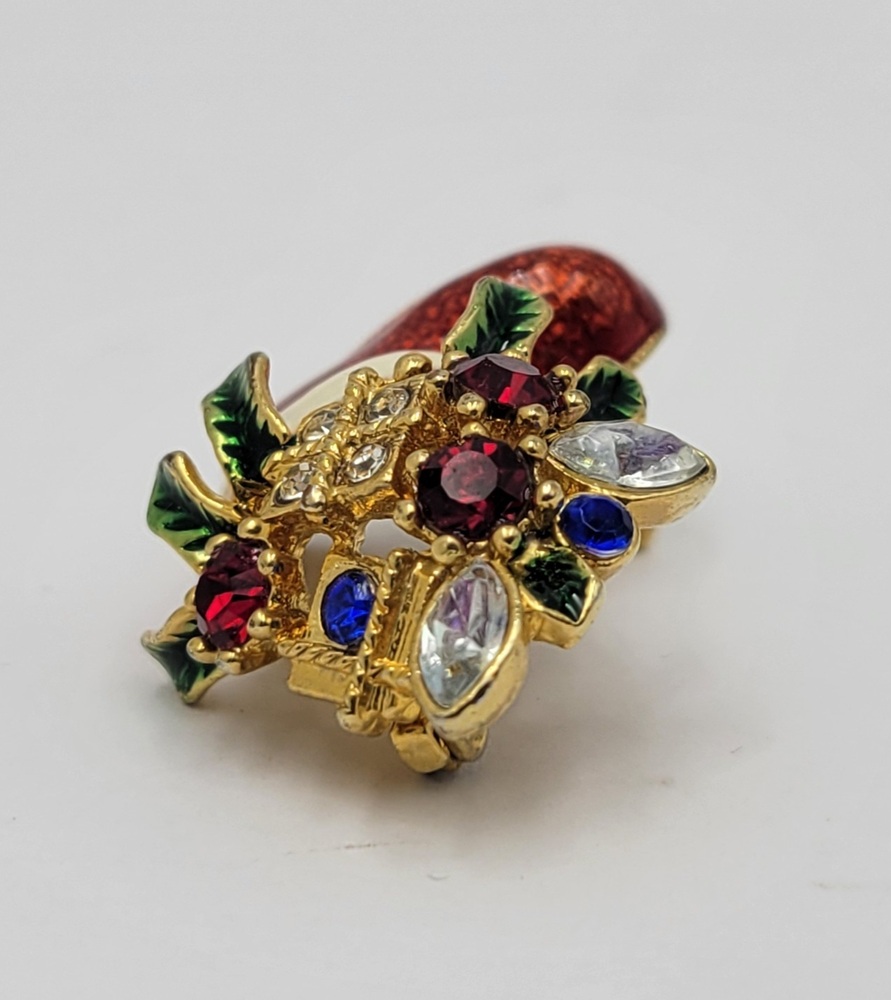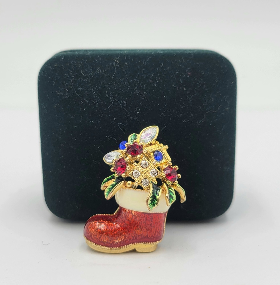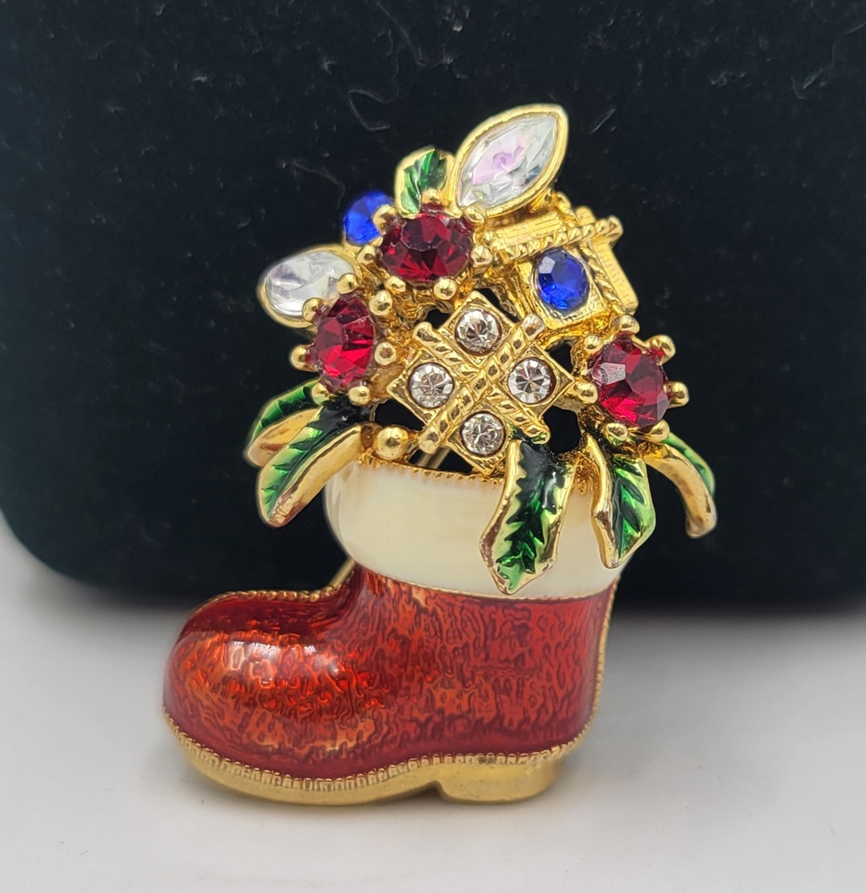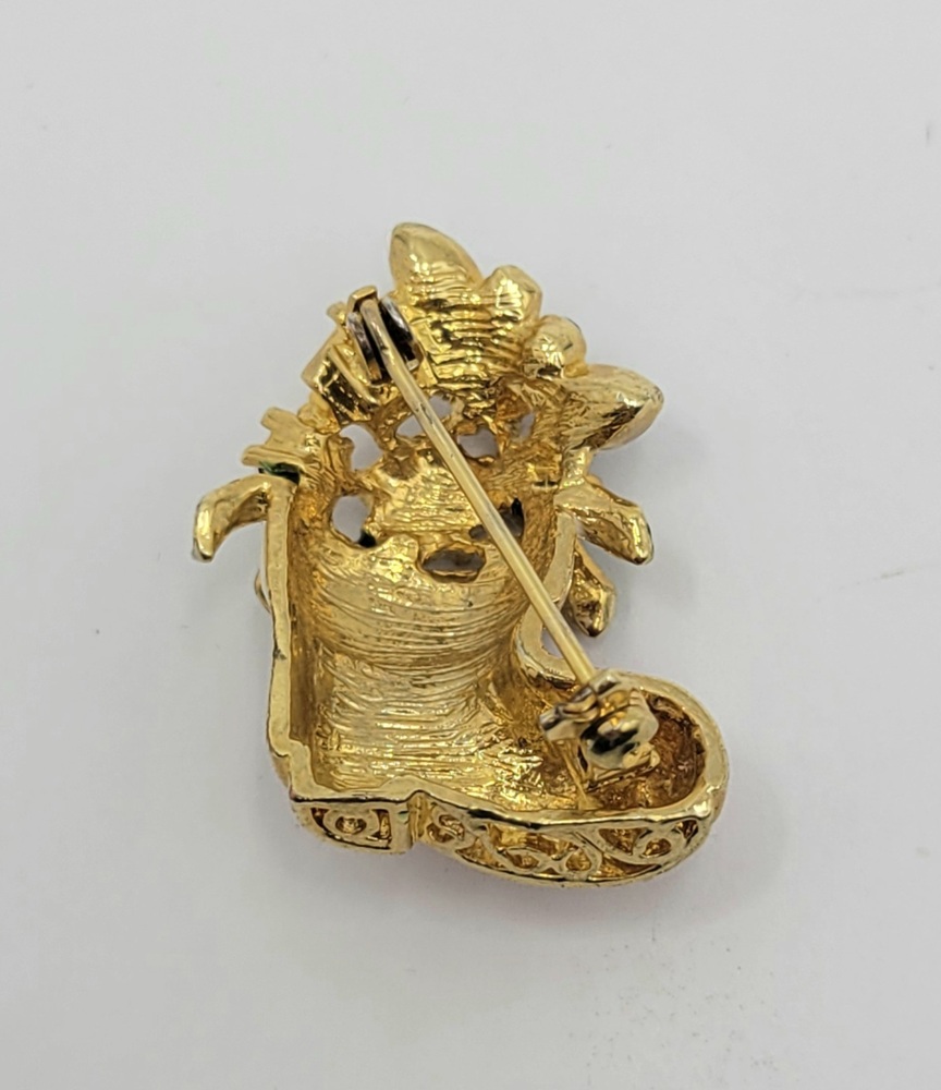 Adorn yourself with the spirit of holidays! Our Gold Tone Jewelled Christmas Stocking Brooch is a shimmering symbol of festive cheer. Crafted intricately with gleaming gold tone metal, it's studded with sparkling jewels that dance under the Yuletide lights. A timeless piece, radiating goodwill and charm!
