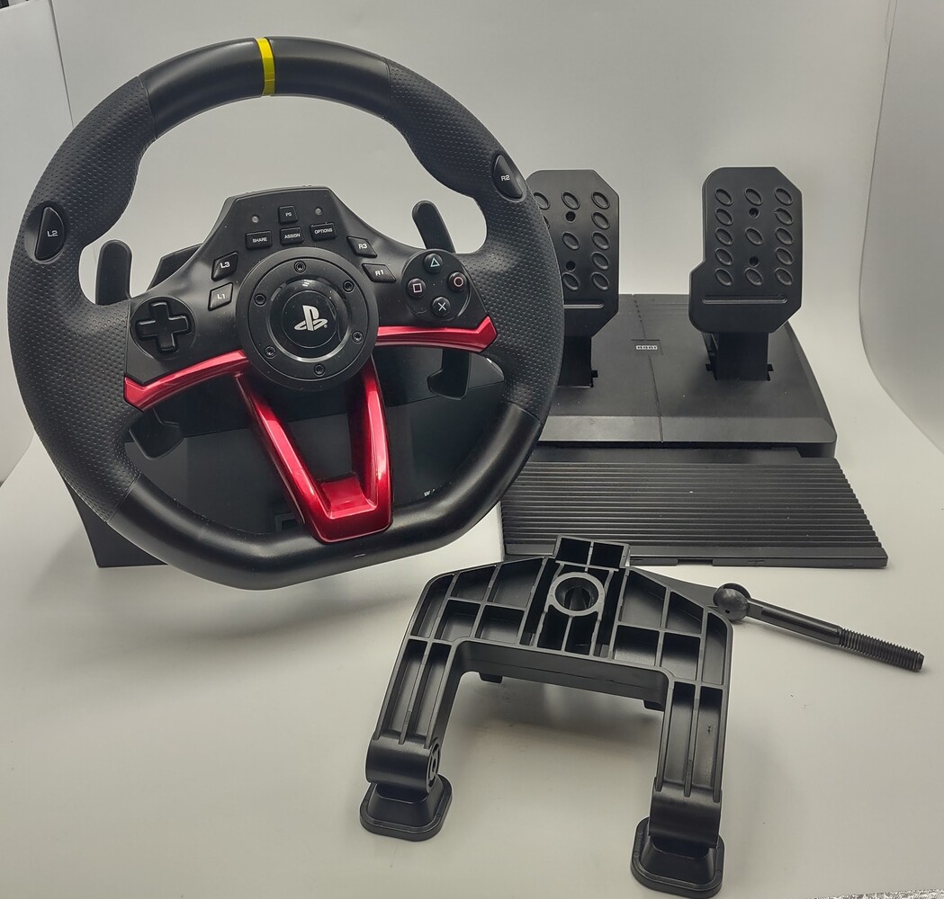 Racing Wheel Controller compatible with the PlayStation 4 and PC gaming. Includes wheel, pedals, and desk clamp.