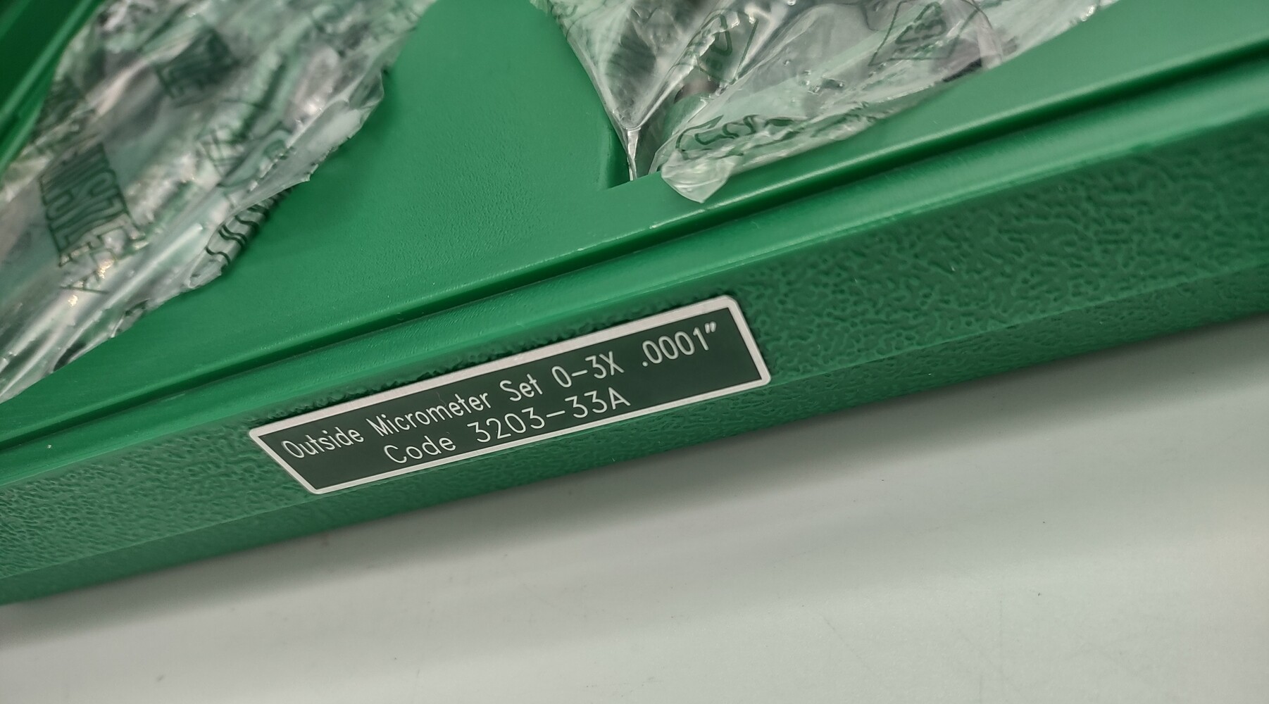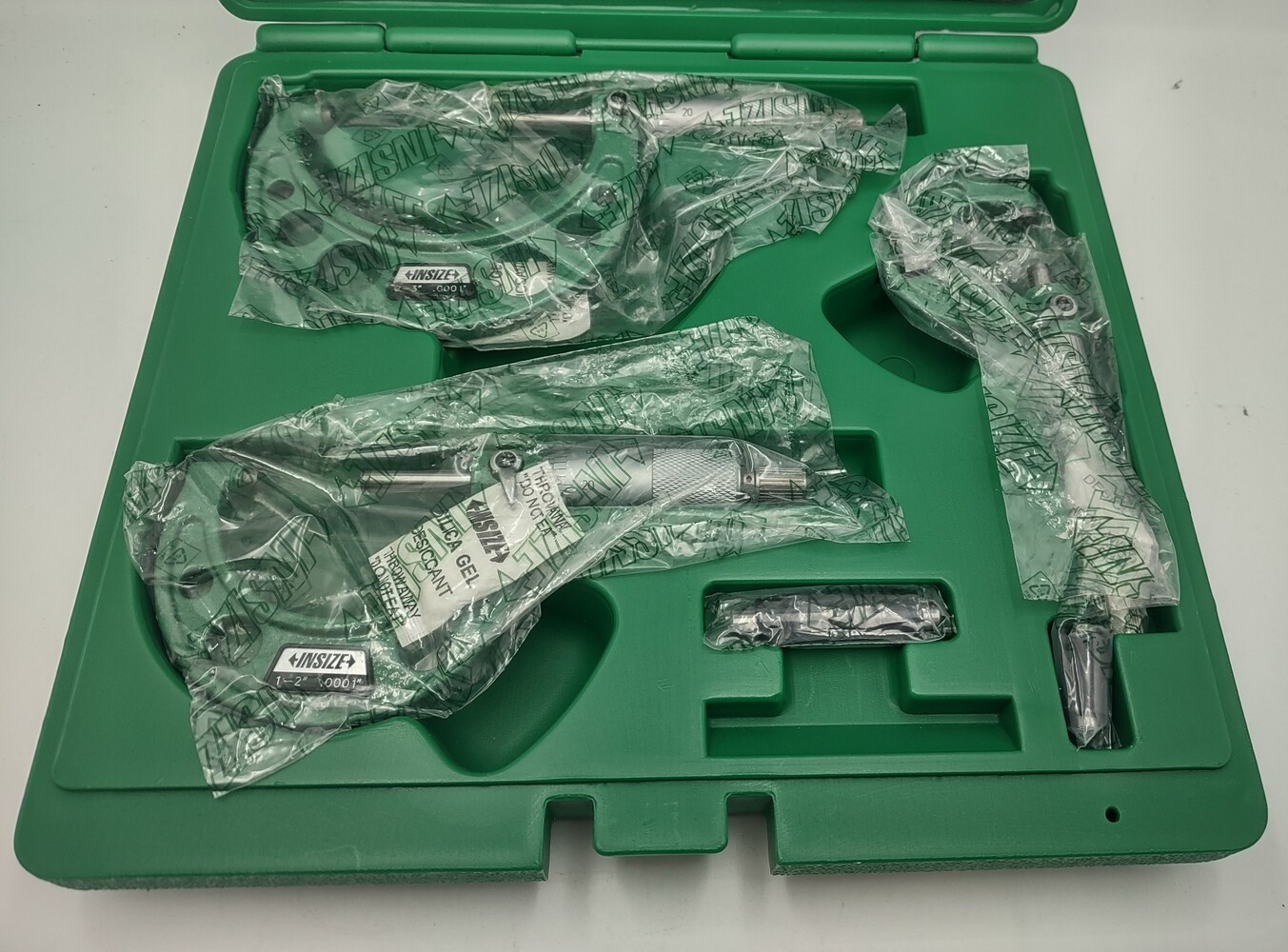 Includes 3 outside micrometers: 0-1", 1-2", and 2-3" each 0.0001", with a 1 and 2 inch standard. All but the 0-1" micrometer are still sealed in their original plastic.