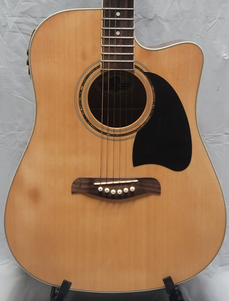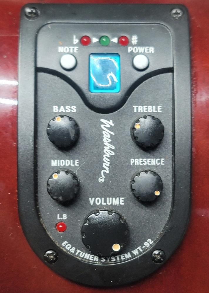 This guitar does have electronics with built-in tuner, but it is missing the battery cover door to test them, so we cannot guarentee the electronics work