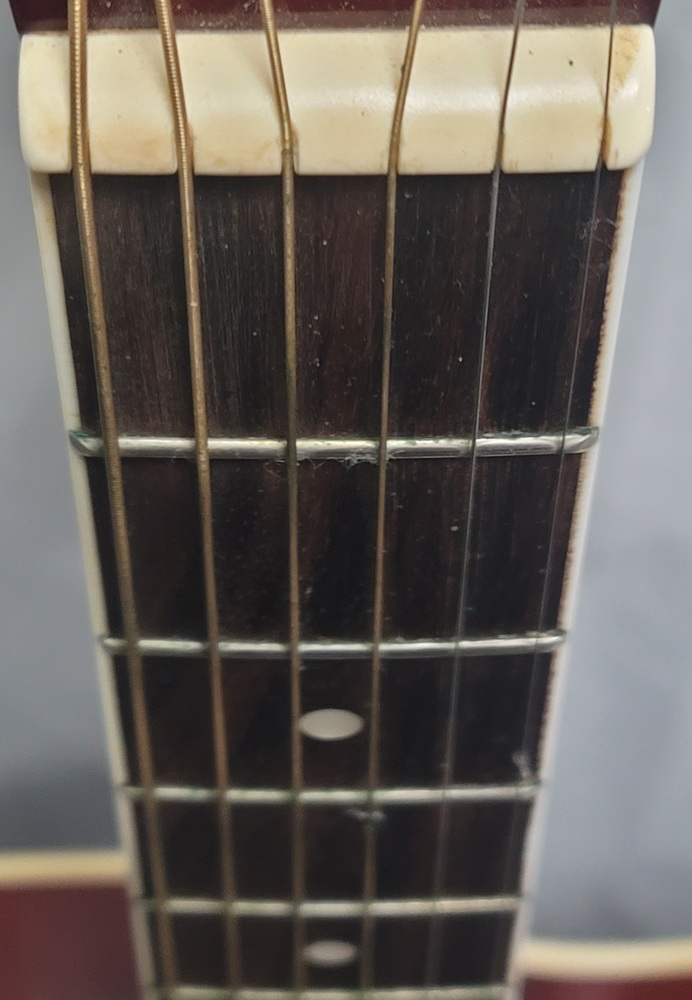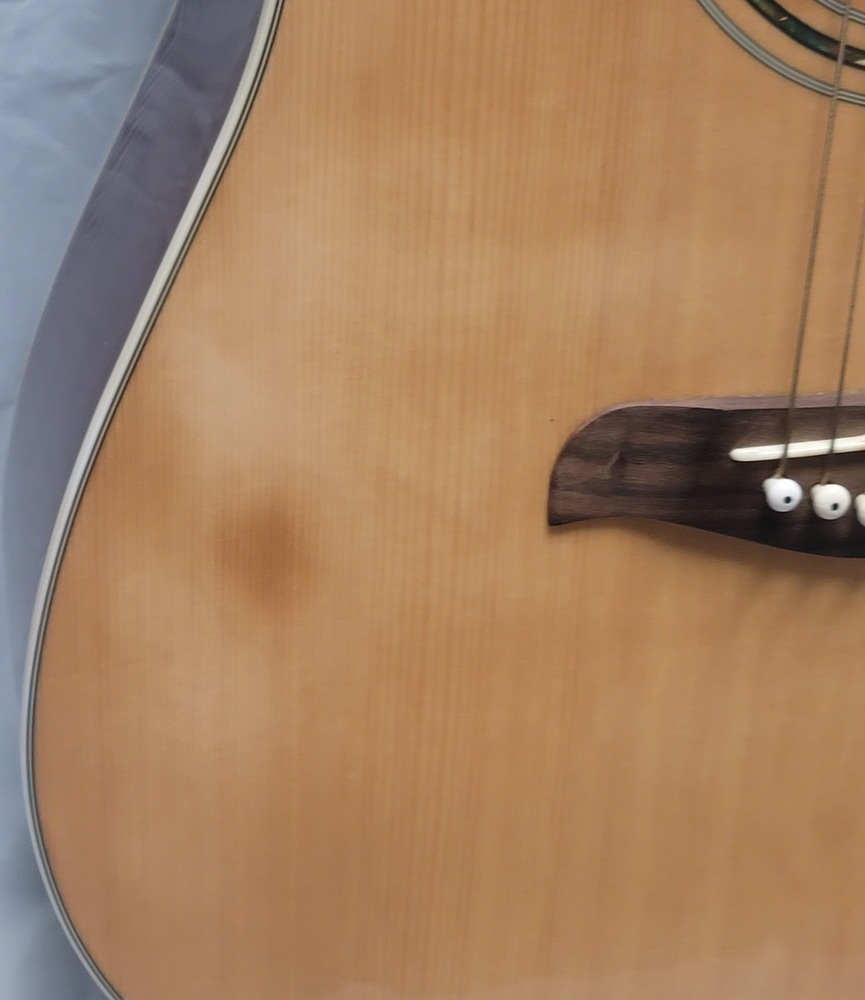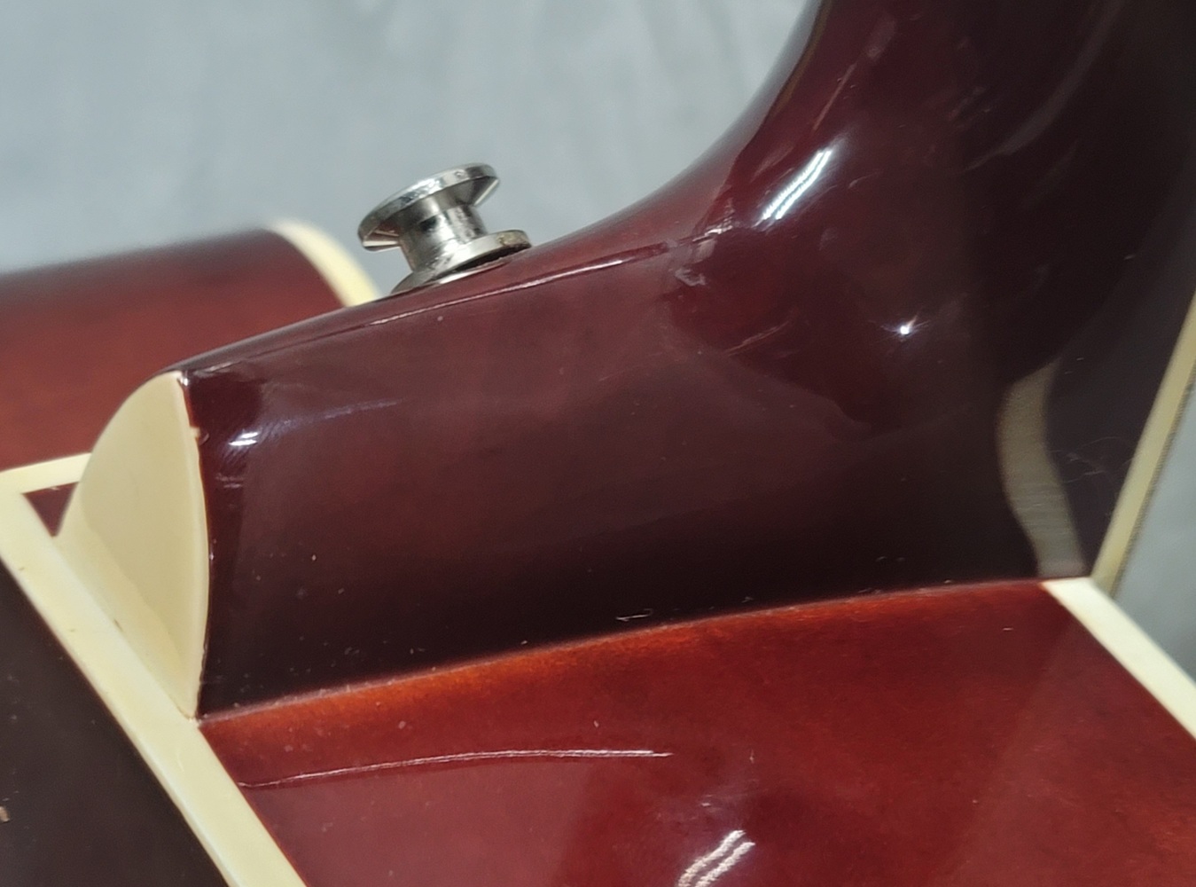 Consmetically there are scuffs to the body, damage to the saddle and the pick guard is starting to lift in one corner, all of which can be seen in the photos