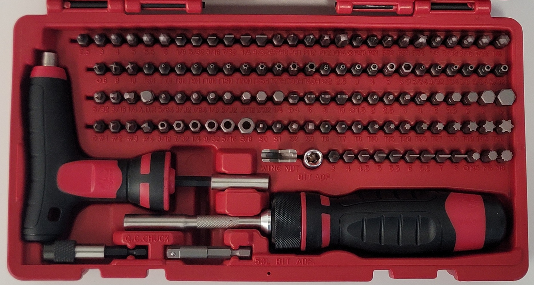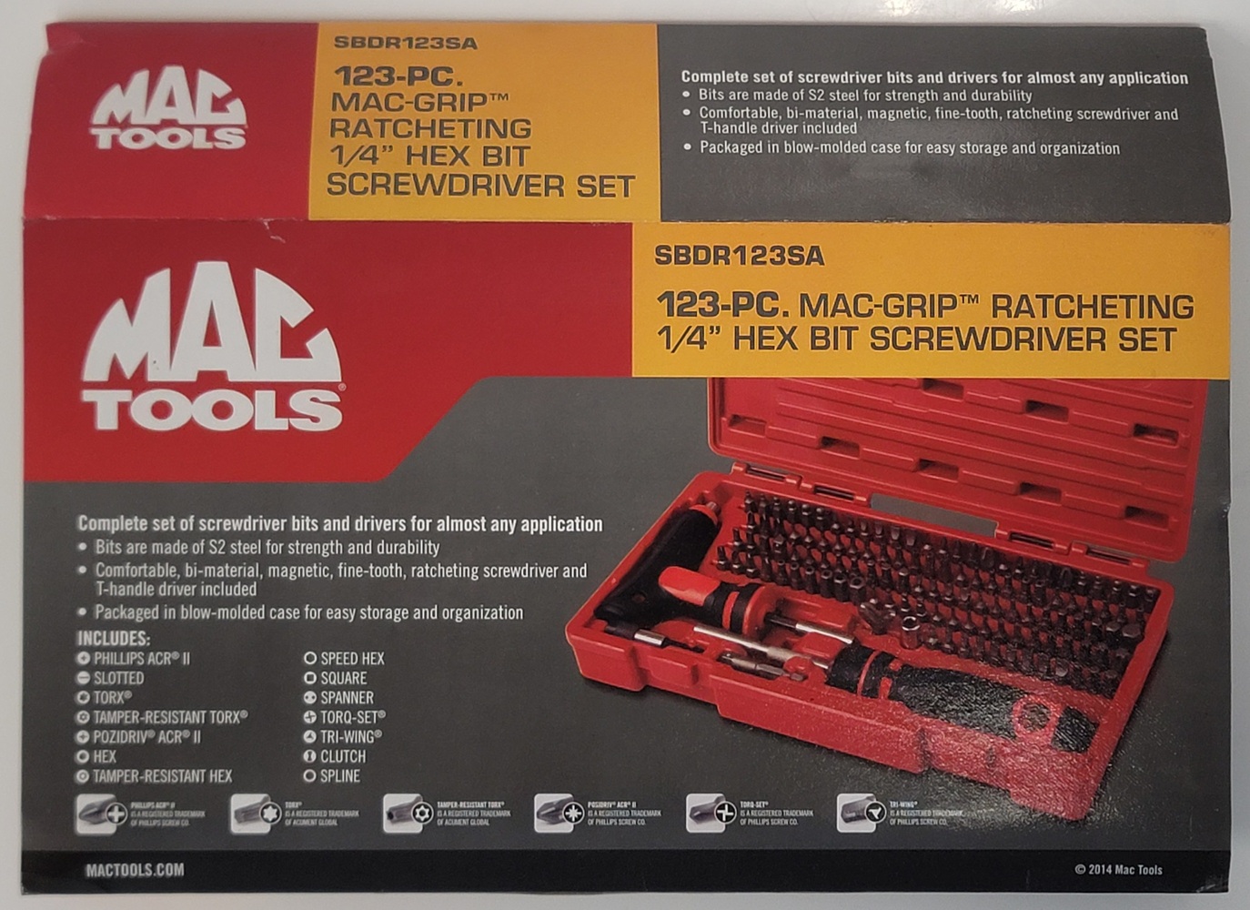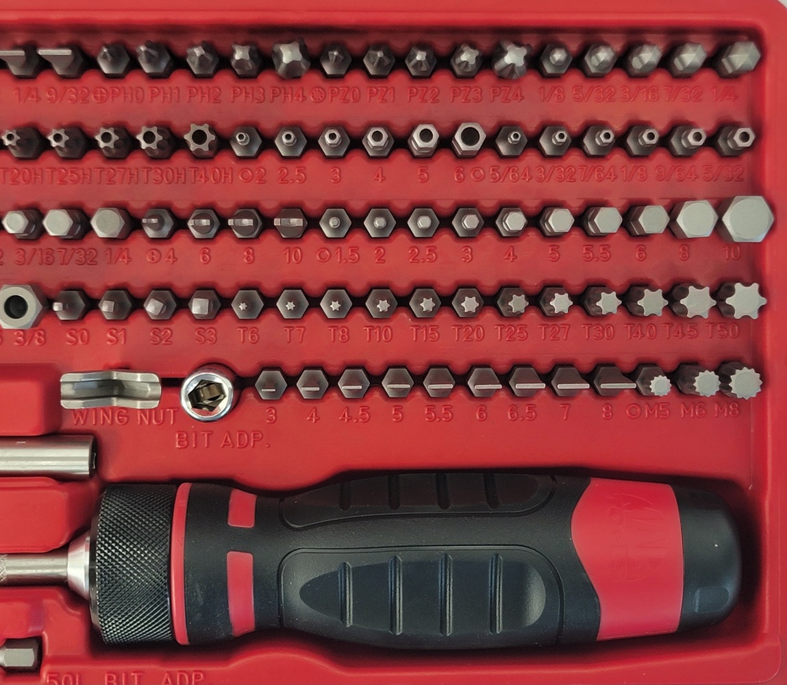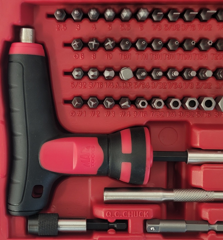 - Comfortable, bi-material, magnetic, fine tooth Mac-Grip handle ratcheting screwdriver and T-handle driver
