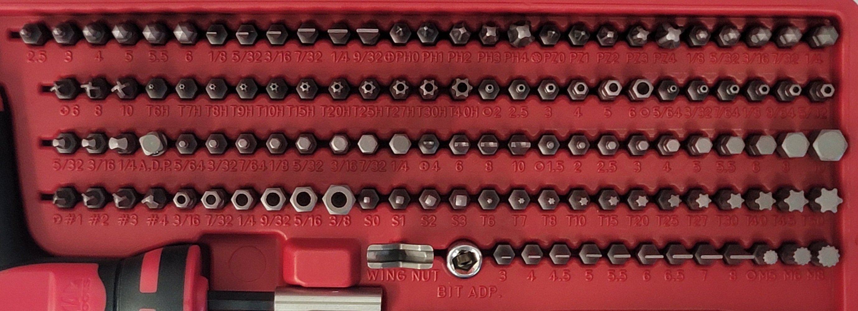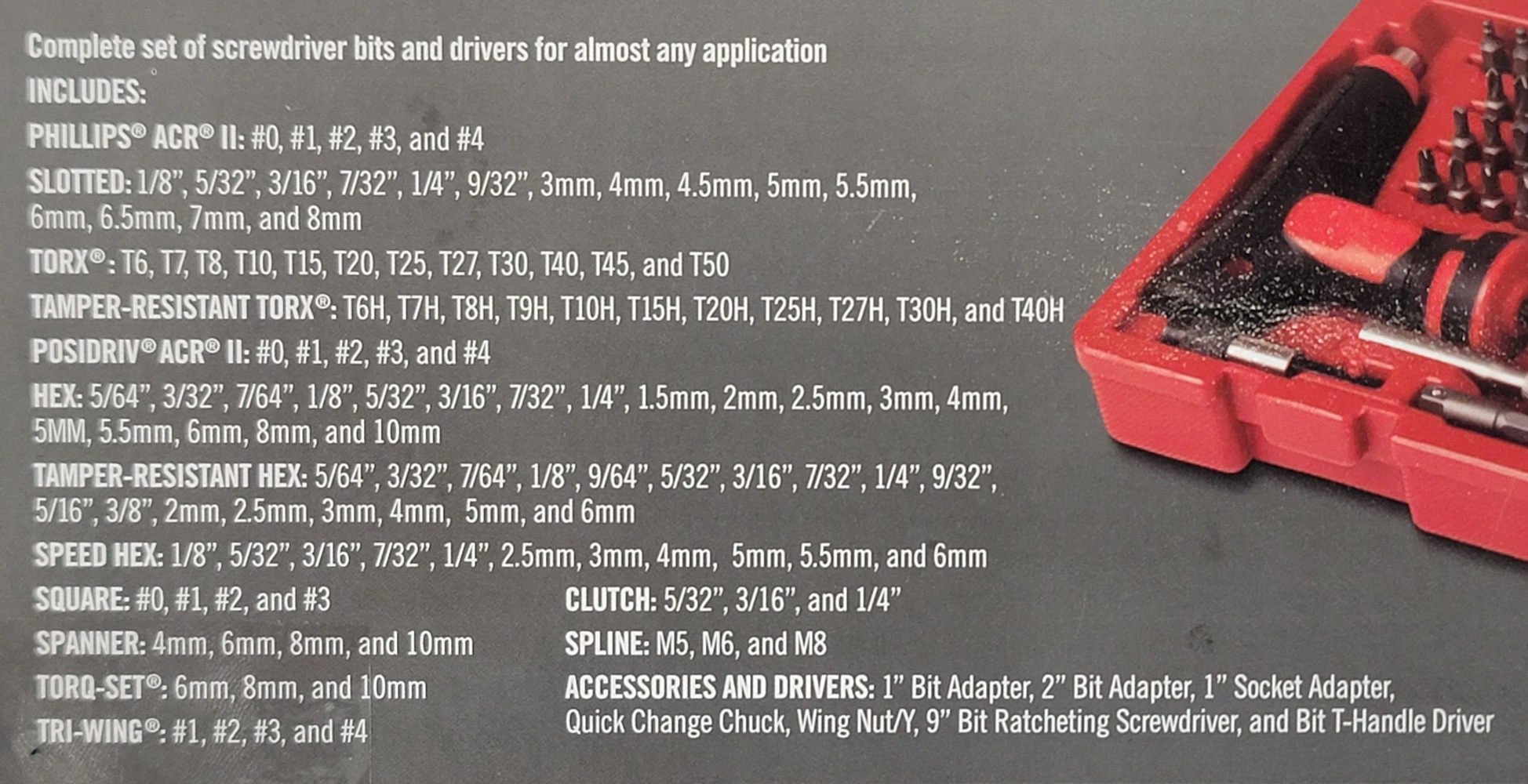 The is a complete set of screwdriver bits and drivers for almost any application with no missing pieces and it is in like new condition, if it was ever used