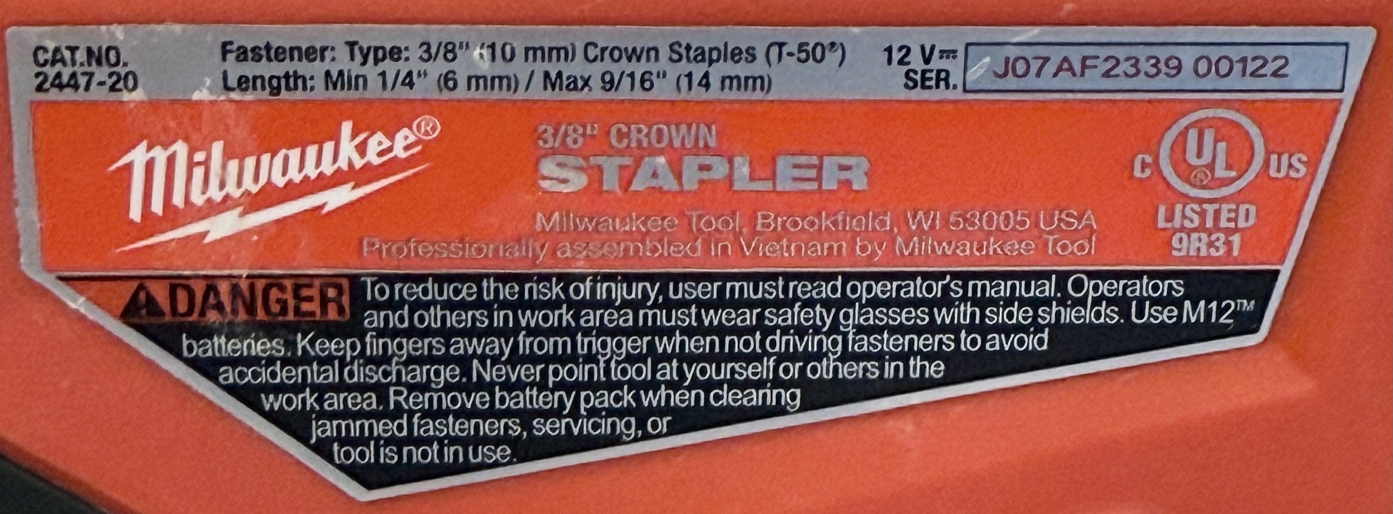 Milwaukee 2447-20 M12 3/8" Crown Cordless Stapler