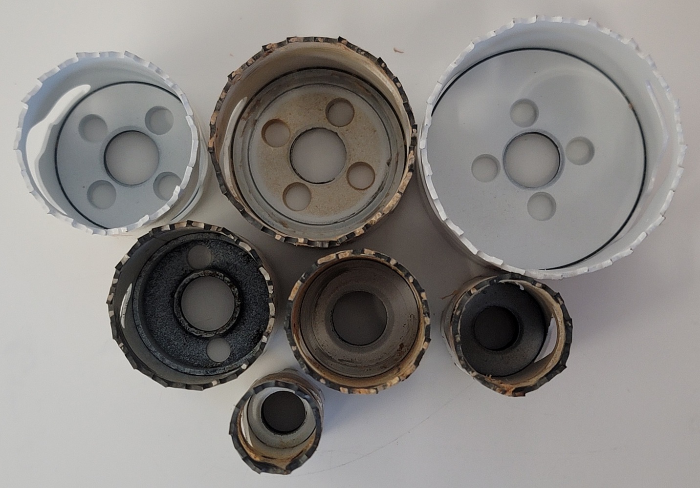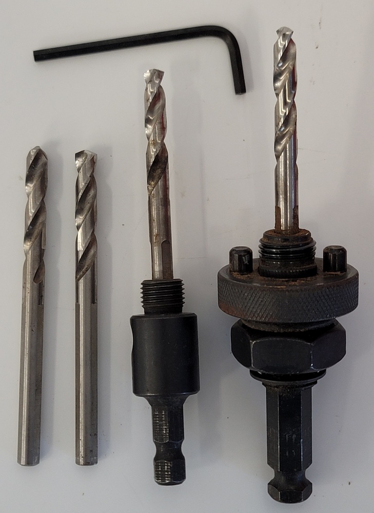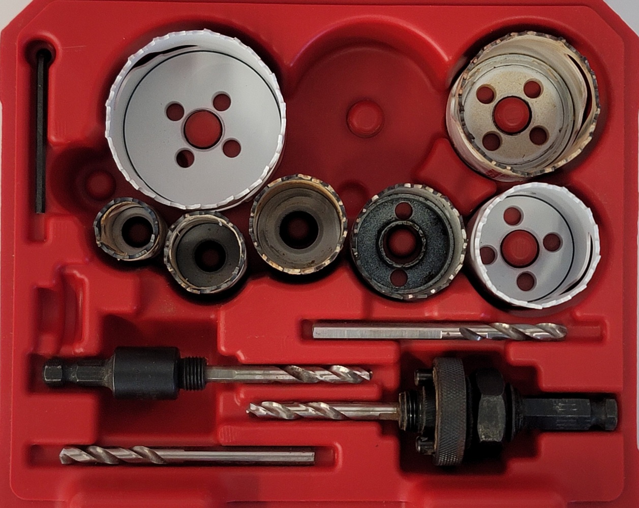 Kit Includes; 7/8", 1-1/8", 1-3/8", 1-5/8", 1-3-4", 2", 2-1/2", 3/8" Hex Shank Arbor, 7/16" No wobble Arbor, 3-1/2" Pilot Bit, 1/8" Hex Key, Blow Mold Case