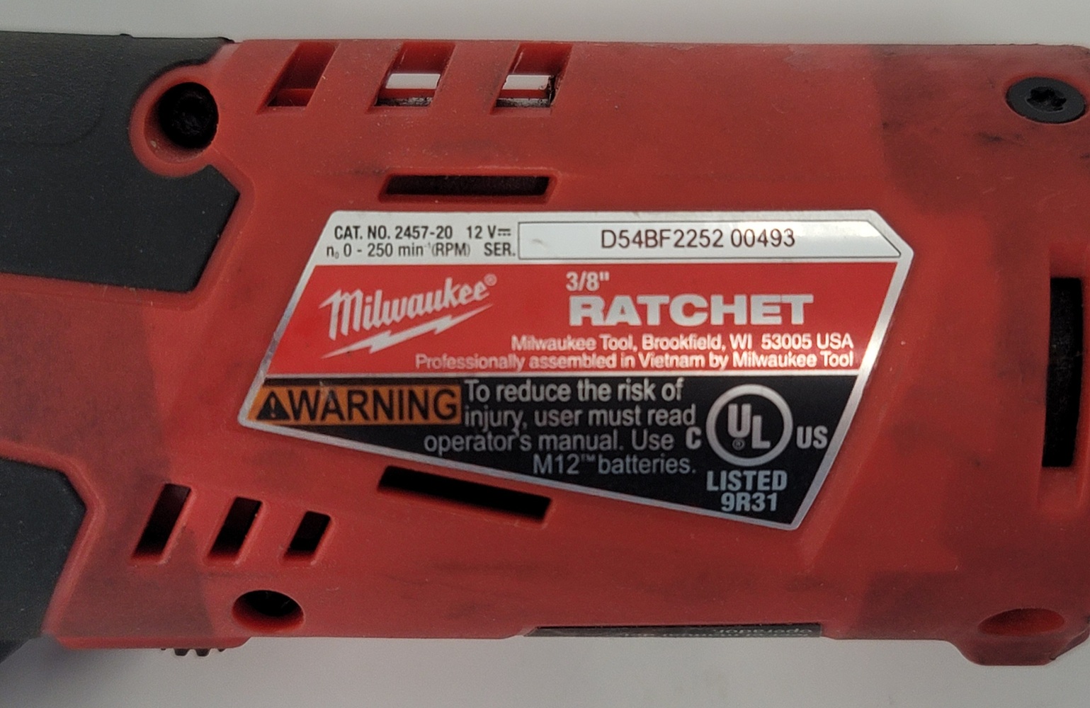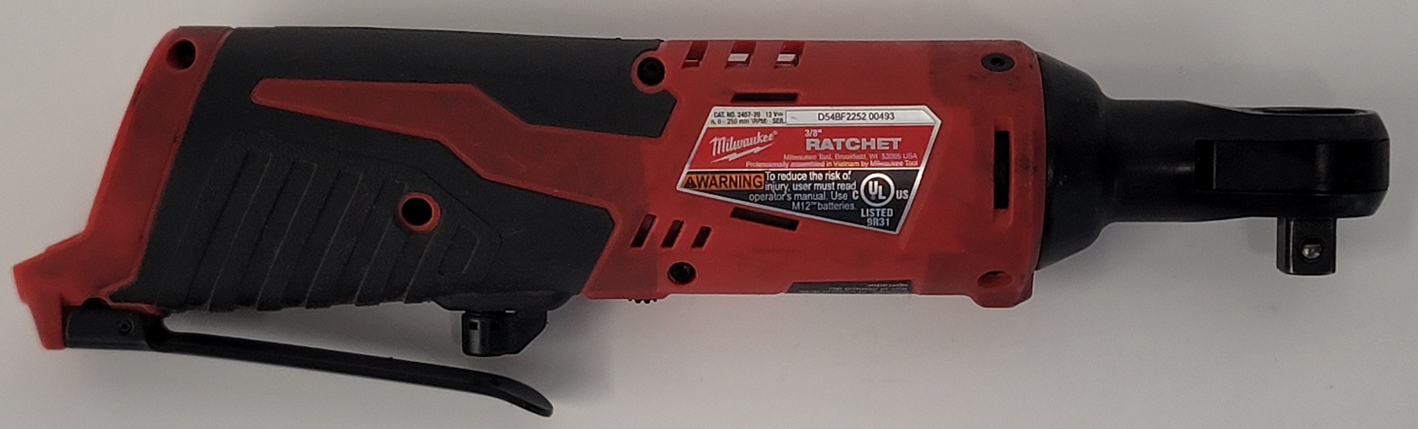 Choose the sub-compact ratchet with best-in-class power, speed and durability. The M12 Cordless 3/8" Lithium-Ion Ratchet is the ideal tool for auto mechanics, maintenance and repair professionals looking for maximum performance and productivity in a subcompact cordless tool. It utilizes a powerful 12V motor to produce up to 35ft-lbs of torque and 250 RPM, giving users the power and speed of a pneumatic ratchet without the airhose. It’s powered by the M12 REDLITHIUM Battery Pack (sold separately), which delivers more work per charge and more work over pack life than the competitors, as well as best-in-class performance in extreme jobsite conditions. At just 10-3/4” long and 1.9lbs, the ratchet is tool-belt portable, and features a 3/4" low-profile head design for work in the tightest of spaces and engine bays. The variable-speed metal trigger and reinforced steel housing provide maximum control and durability with any application.