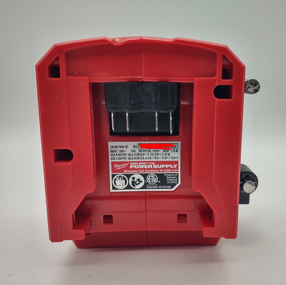 The Milwaukee M18 TOP-OFF 175W Powersupply delivers faster simultaneous power to personal devices and small electronics. Attach any M18 battery to provide continuous power or recharge devices with (1) AC 120V outlets, (1) USB-C PD port, and (1) USB-A port!