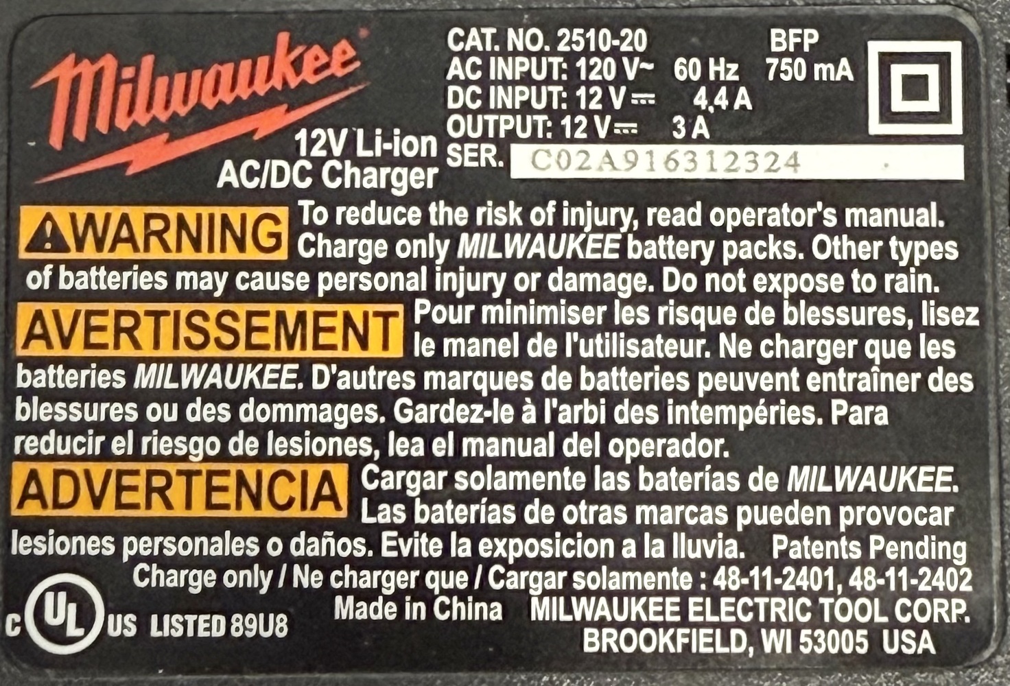 Milwaukee Model 2510-20 12V AC/DC Wall and Vehicle Charger