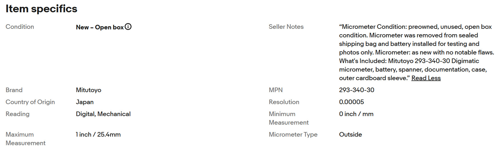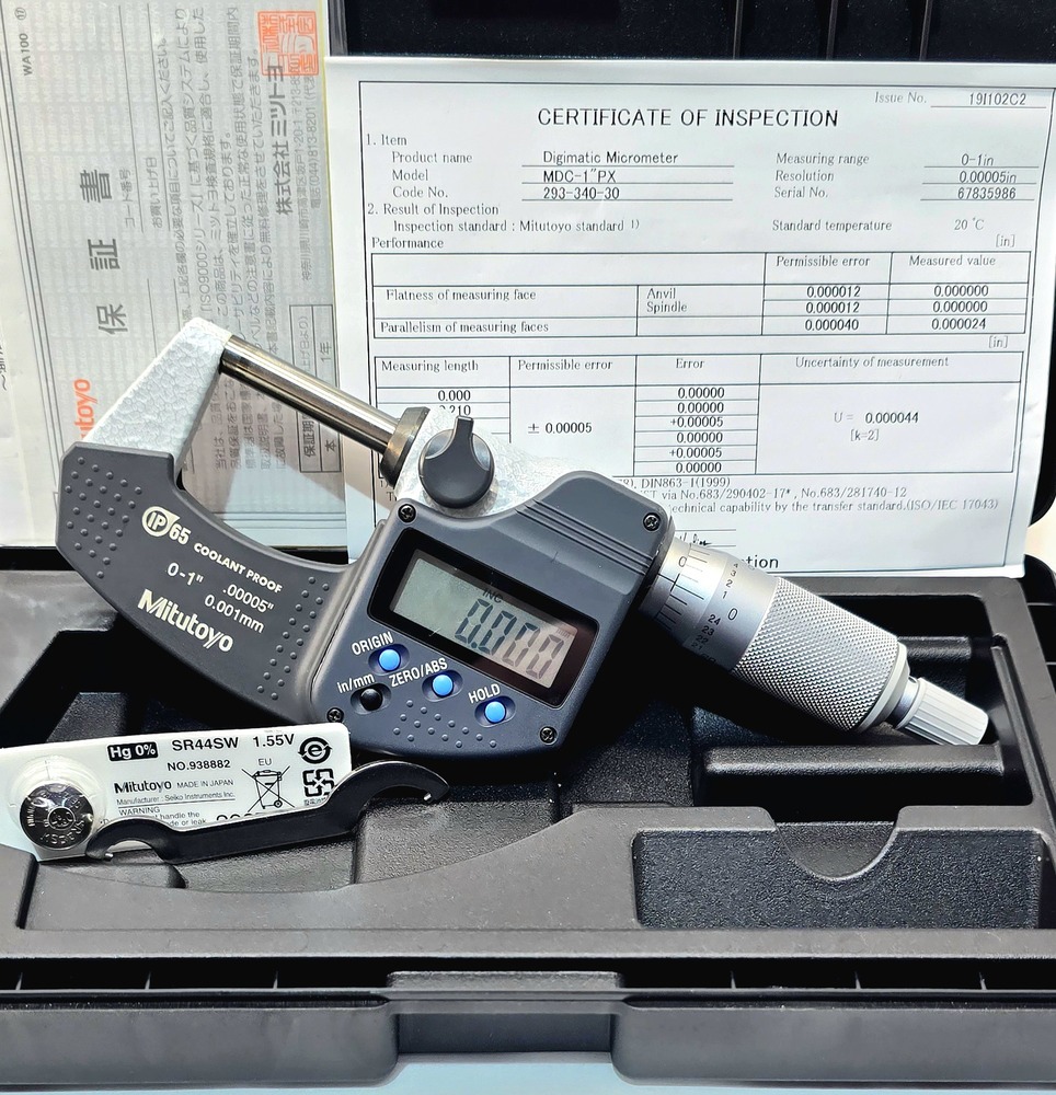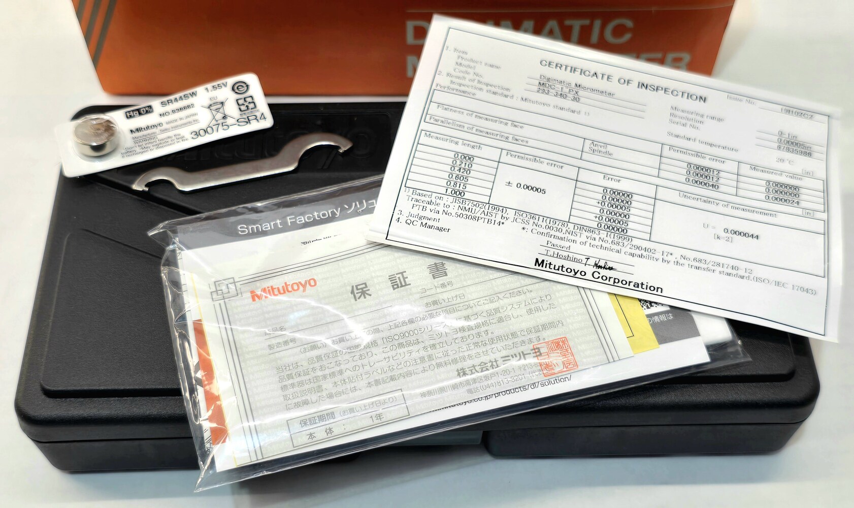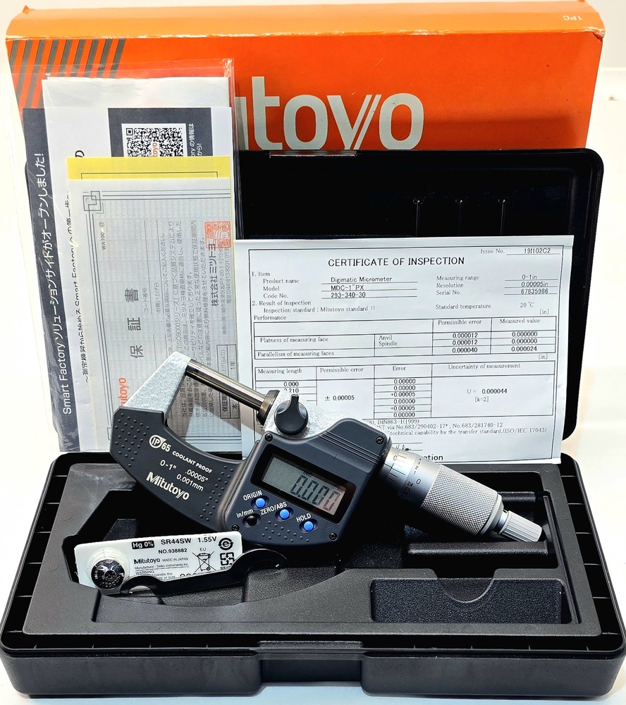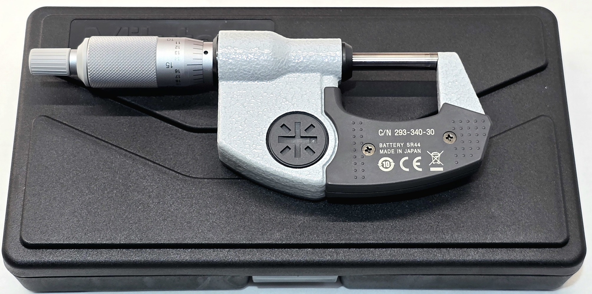 Micrometer Condition: preowned, unused, open box condition. Micrometer was removed from sealed shipping bag and battery installed for testing and photos only. Micrometer Appearance: as new with no notable flaws. What's Included: Mitutoyo 293-340-30 Digimatic micrometer, battery, spanner, documentation, case, outer cardboard sleeve.