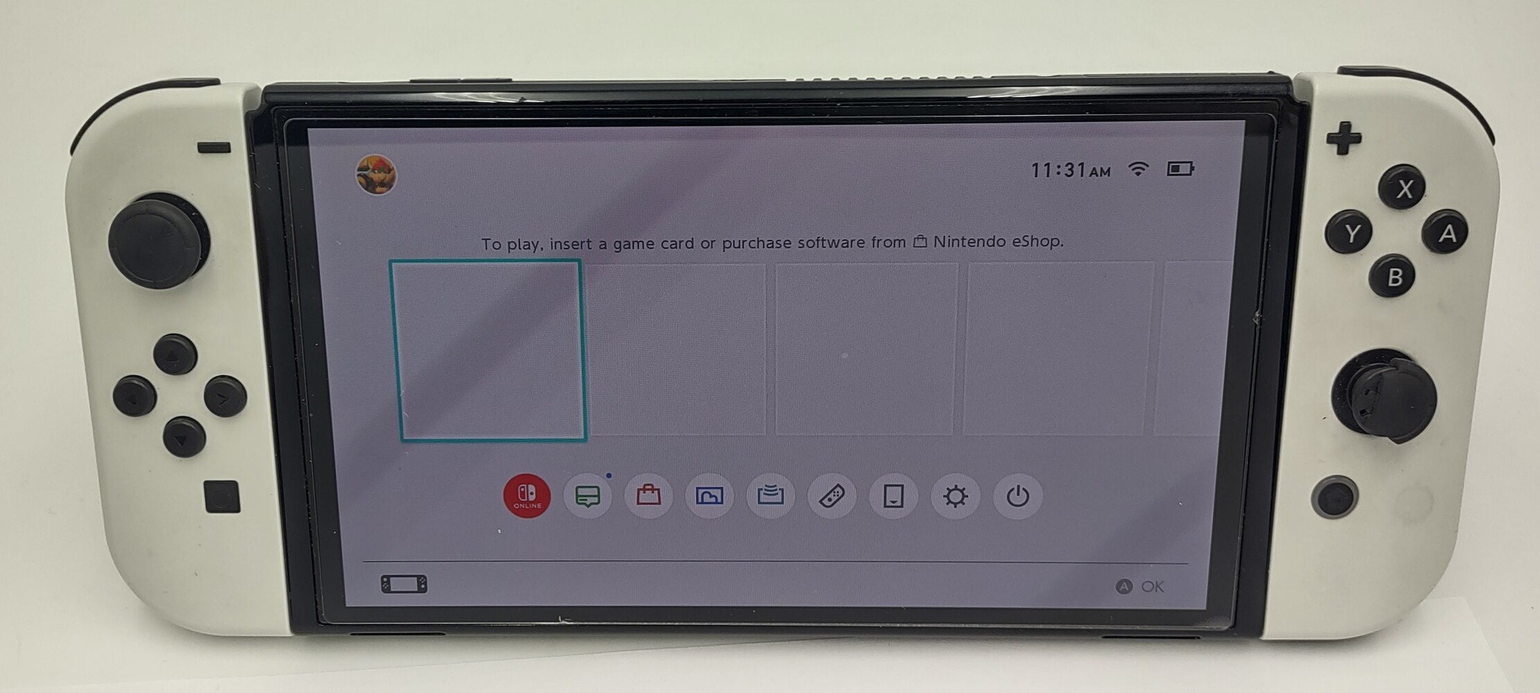 System has been tested and fully reset. There is some damage to the right Joy-Con, please see photos.