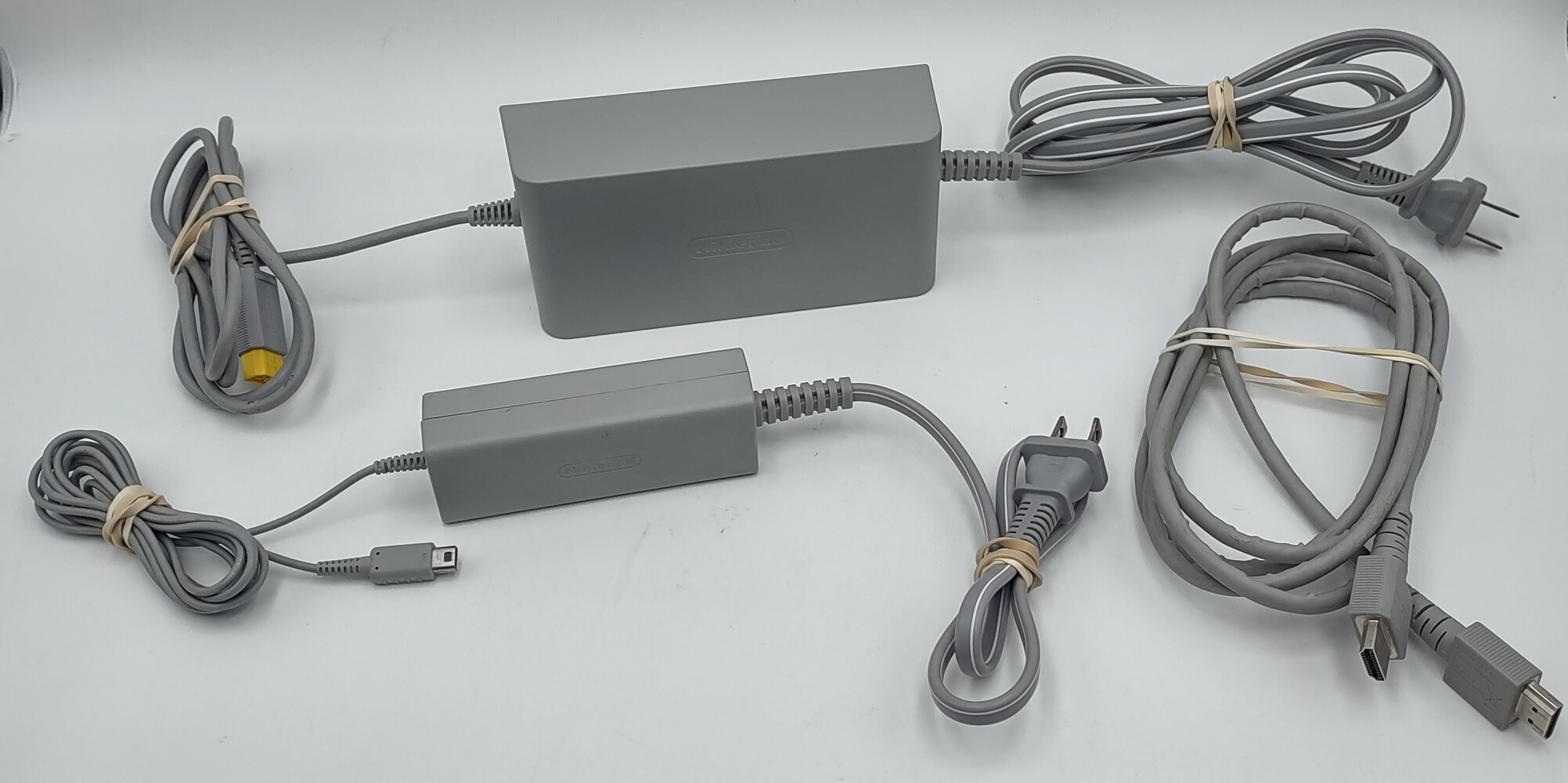 Comes with GamePad, GamePad dock, stylus, Wii U Pro Controller, sensor bar, 3x power cords, and HDMI cord. The HDMI is starting to fray near the end.