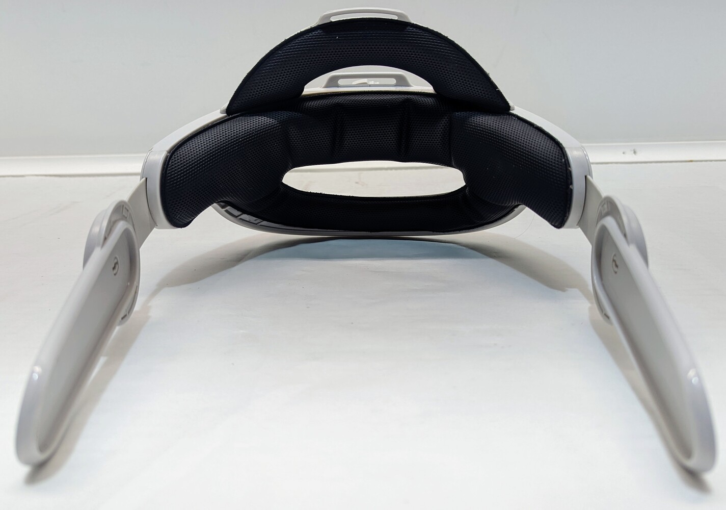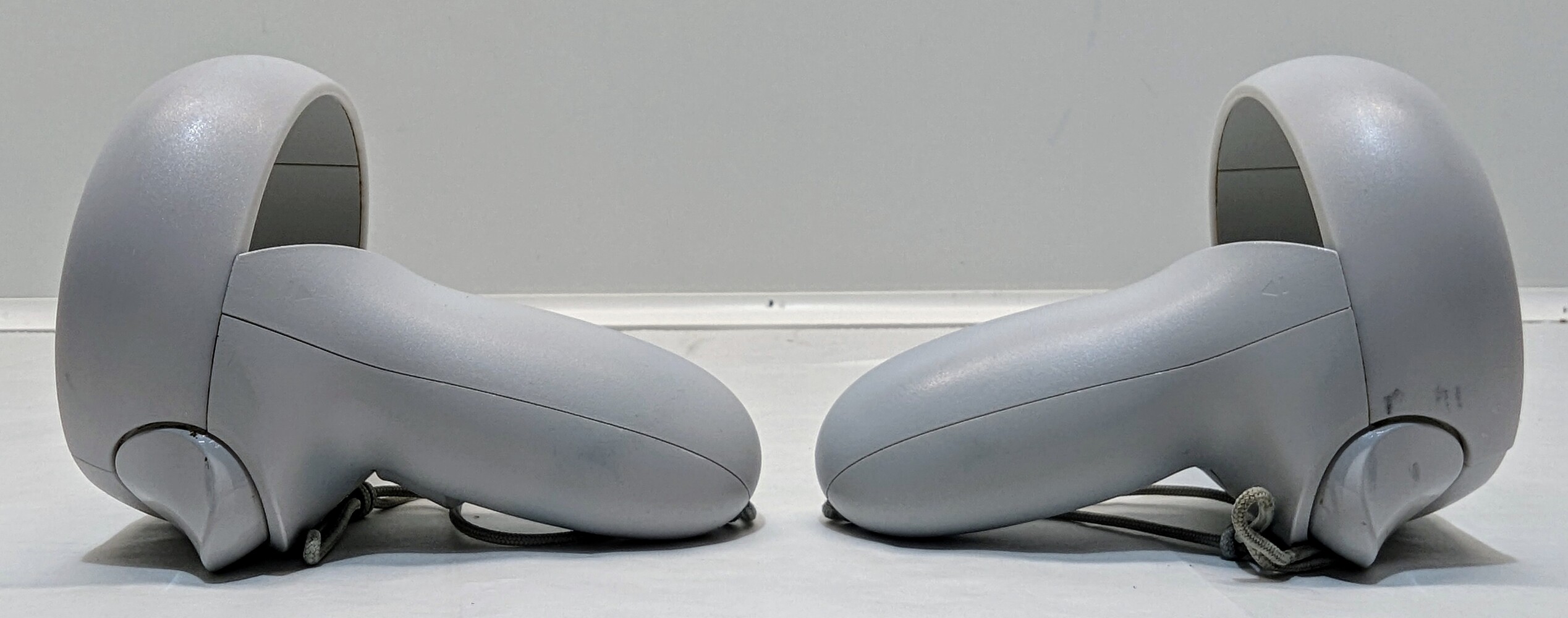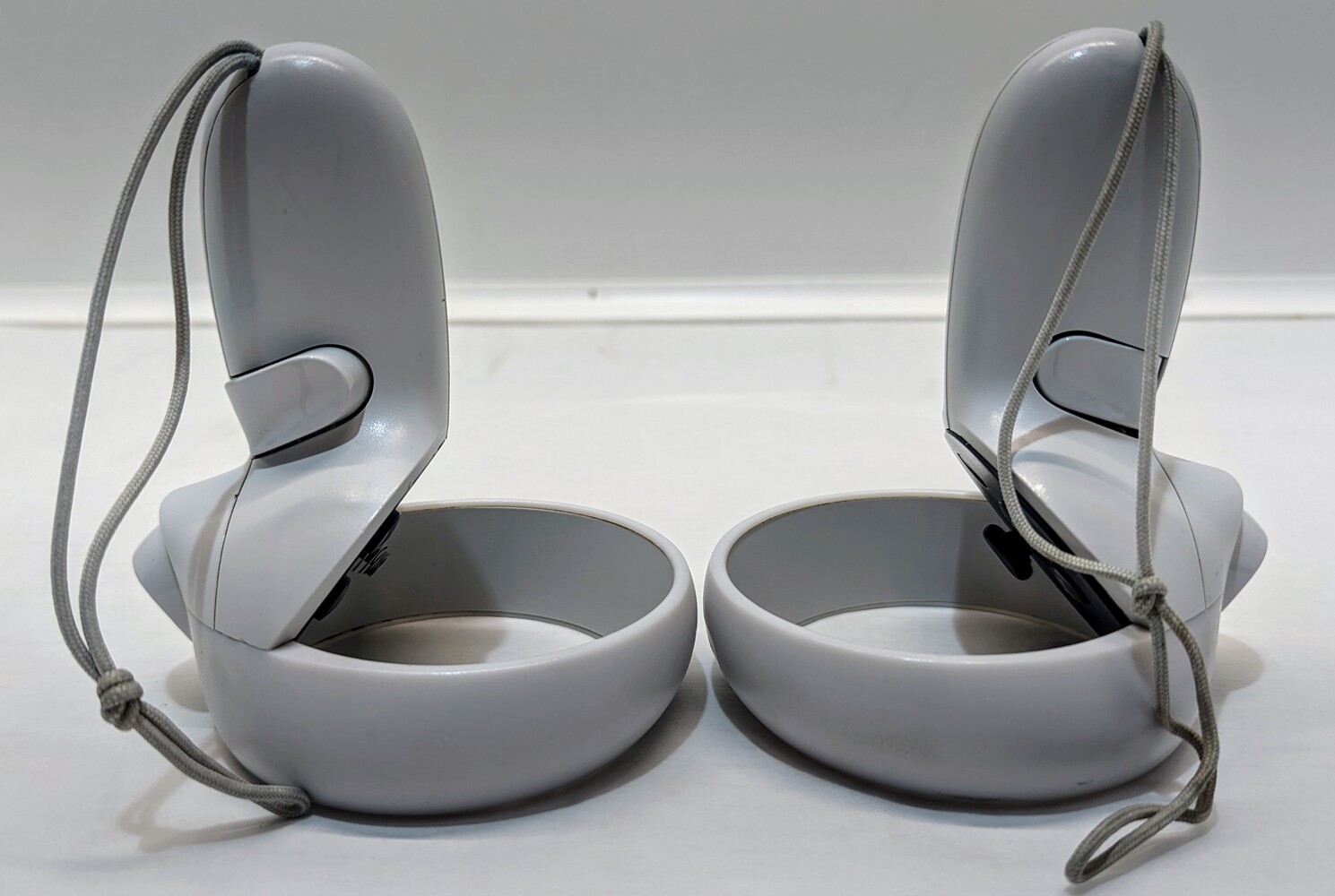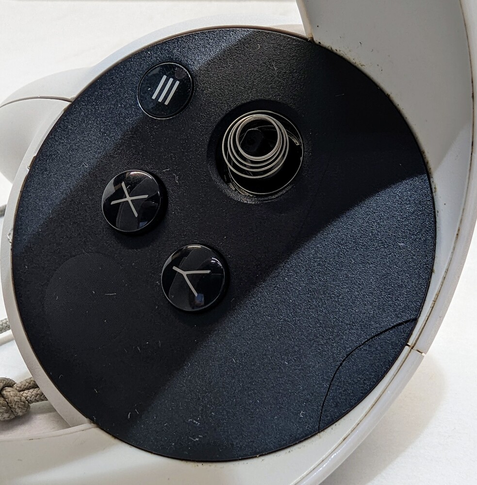 **PLEASE NOTE: The headset is in good working condition however the front is scratched. The inside faceplate is cracked along the nose portion of the plastic. The controllers do have signs of heavy use with scuffs and scratches along the outside of the protective ring and along the sides. The left thumbstick is missing the rubber grip and plastic cover but it is in working condition. There is NO CHARGER included. Please see photo and details.**