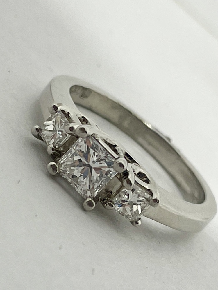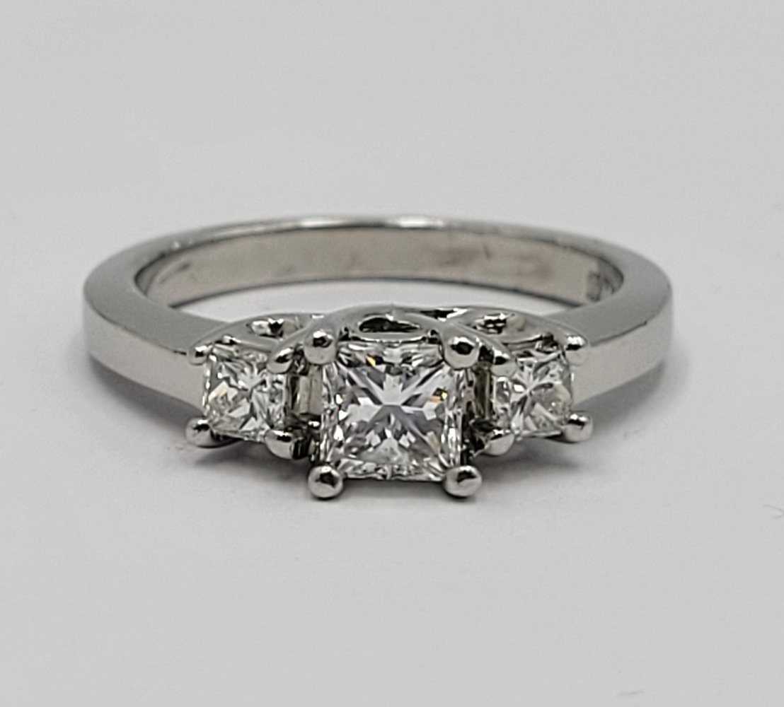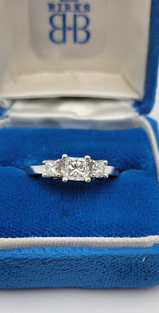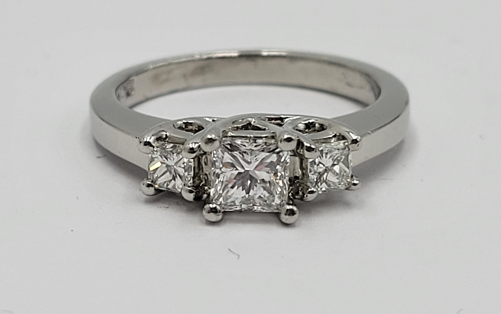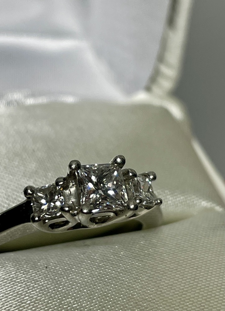 This listing is for one ladies' platinum and princess cut diamond ring. The ring dazzles with three princess cut diamonds totalling 1.00ct. The ring is size 7. Appraisal for the ring is included!
