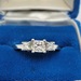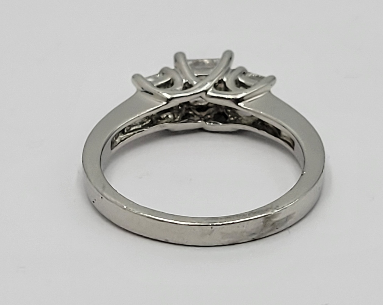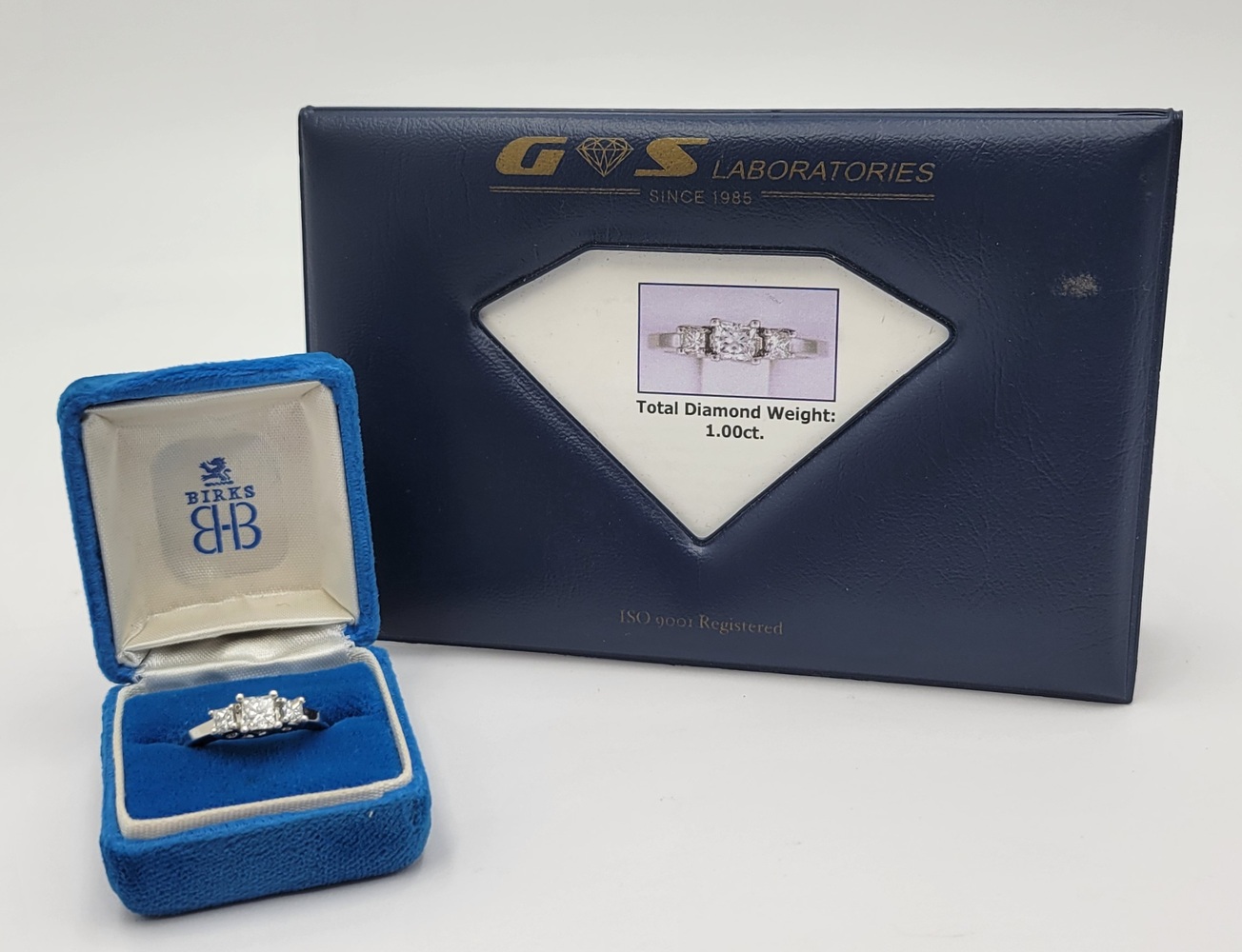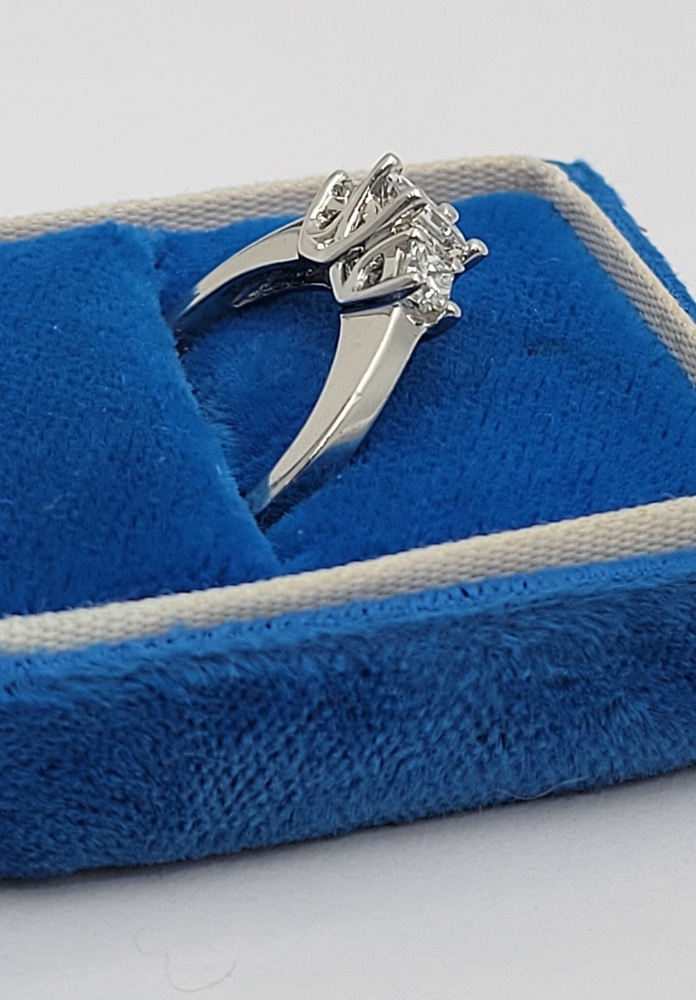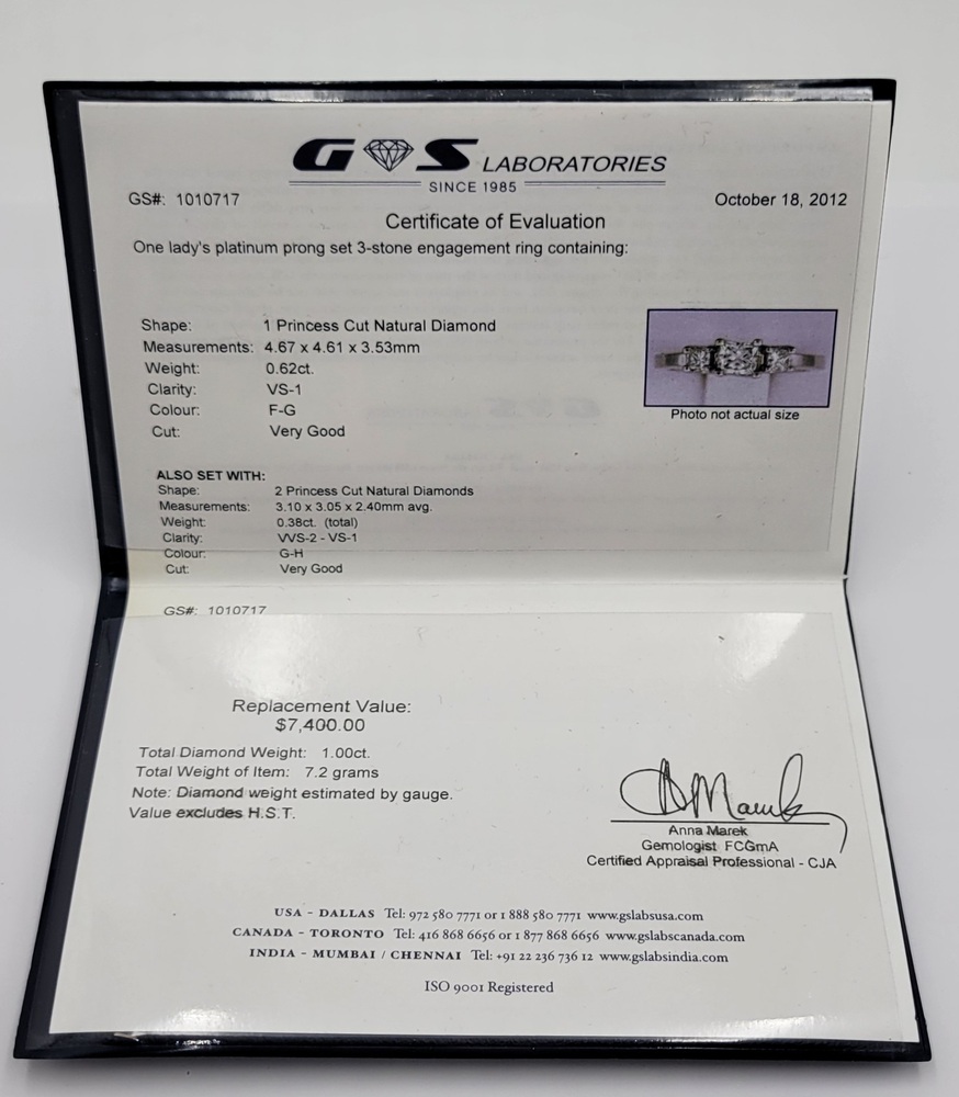 This listing is for one ladies' platinum and princess cut diamond ring. The ring dazzles with three princess cut diamonds totalling 1.00ct. The ring is size 7. Appraisal for the ring is included!
