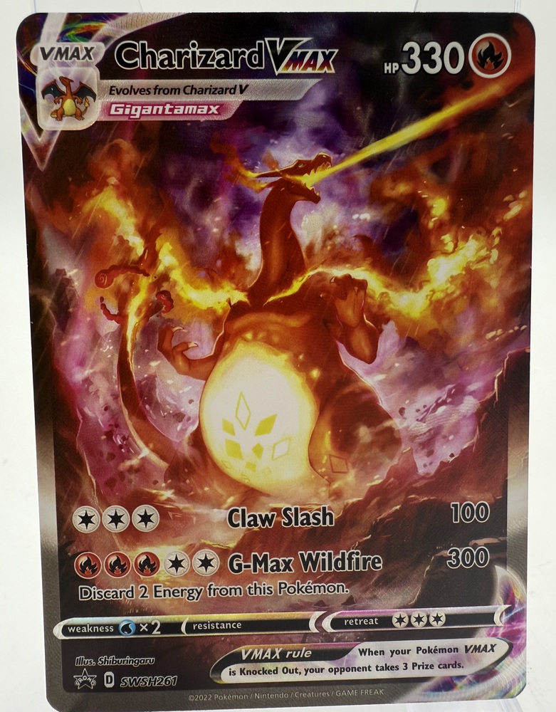 Charizard VMAX - SWSH261 is a highly desired card from Pokémon's Sword & Shield series. It features a Gigantamax Charizard with a HP of 330 and attacks like Claw Scratch and G-Max Wildfire. Its rarity and fan favoritism make it both a valuable collector's item and a potent card in battle.