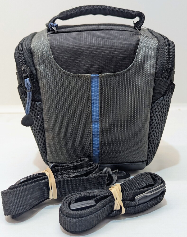 **PLEASE NOTE: This camera is in good working condition however the door to the HDMI/Multi connection doesn't fully close. The camera doesn't have it's original charger but does have the original battery. The bag does show signs of use and has light staining on the back and top. Please see photo and details.**