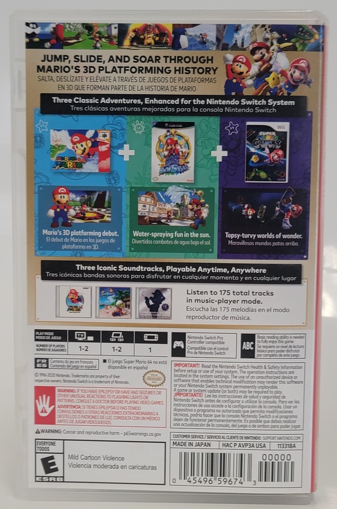 Super Mario 3D All-Stars is a 2020 platform game compilation developed and published by Nintendo for the Nintendo Switch. It commemorates the 35th anniversary of Nintendo's Super Mario series, with ports of Super Mario 64 (1996), Super Mario Sunshine (2002), and Super Mario Galaxy (2007) in high-definition.