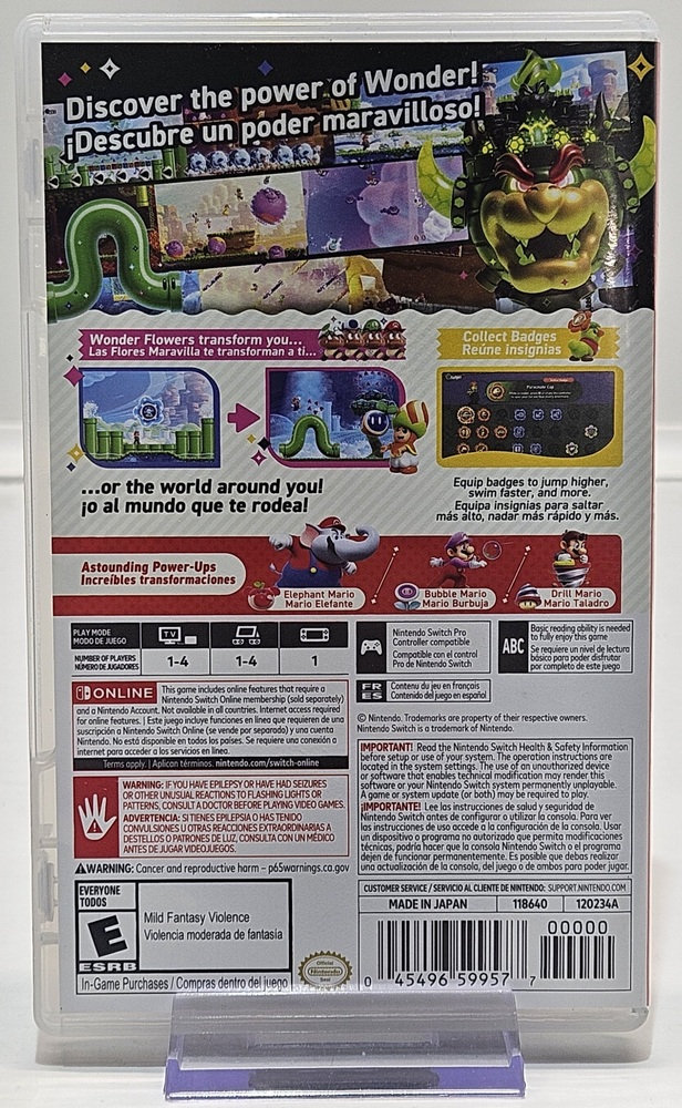 Leap into a charming and vibrant side-scrolling Mario game, filled with surprising twists! Master the power of the Wonder Flowers, transforming gameplay into a cascade of whimsical events - from space-floating escapades to giant Spike-Ball rampages. Play as beloved characters, or choose newcomer Yoshi or Nabbit for a damage-free play. Wield wacky power-ups, like Elephant Fruit, and customize your play style with exciting badges. Challenge your friends in local or online modes, and even seek help from global Mario enthusiasts with online silhouettes. Set free the whimsical Flower Kingdom from Bowser's wonder grip in this truly personal Mario adventure!