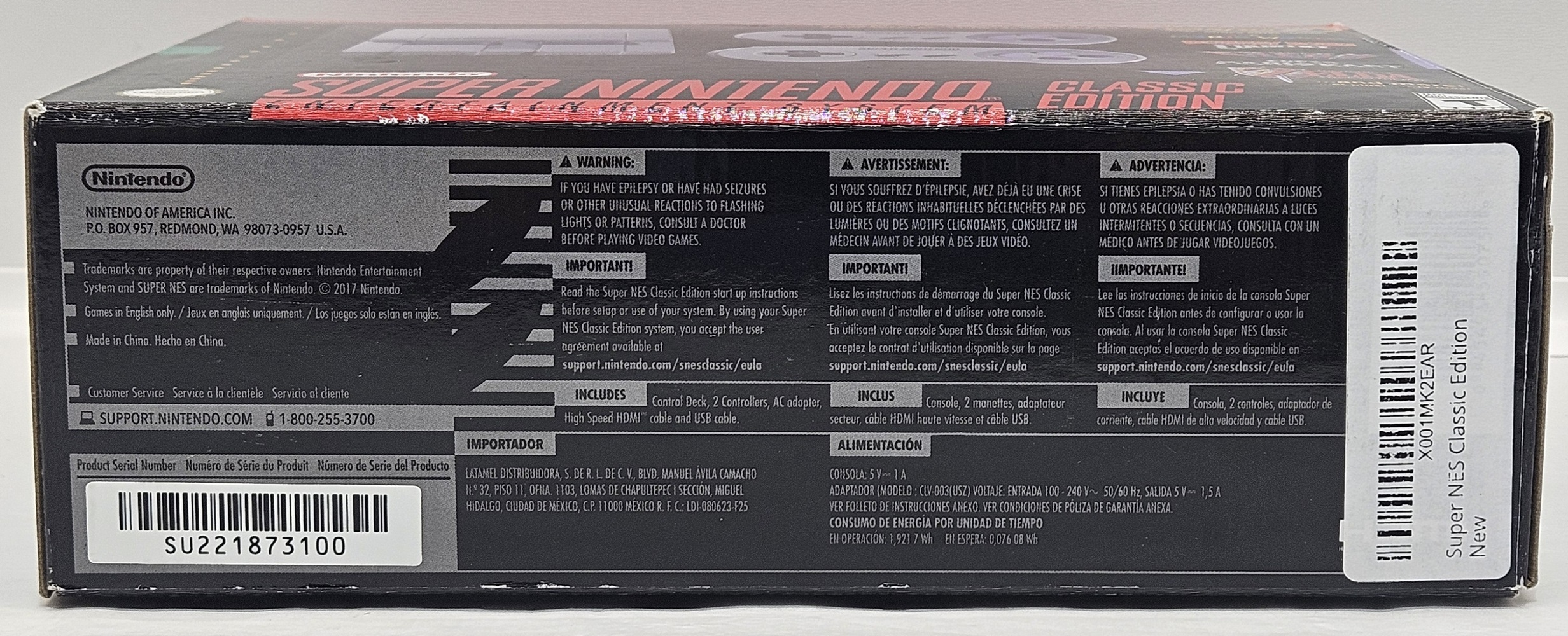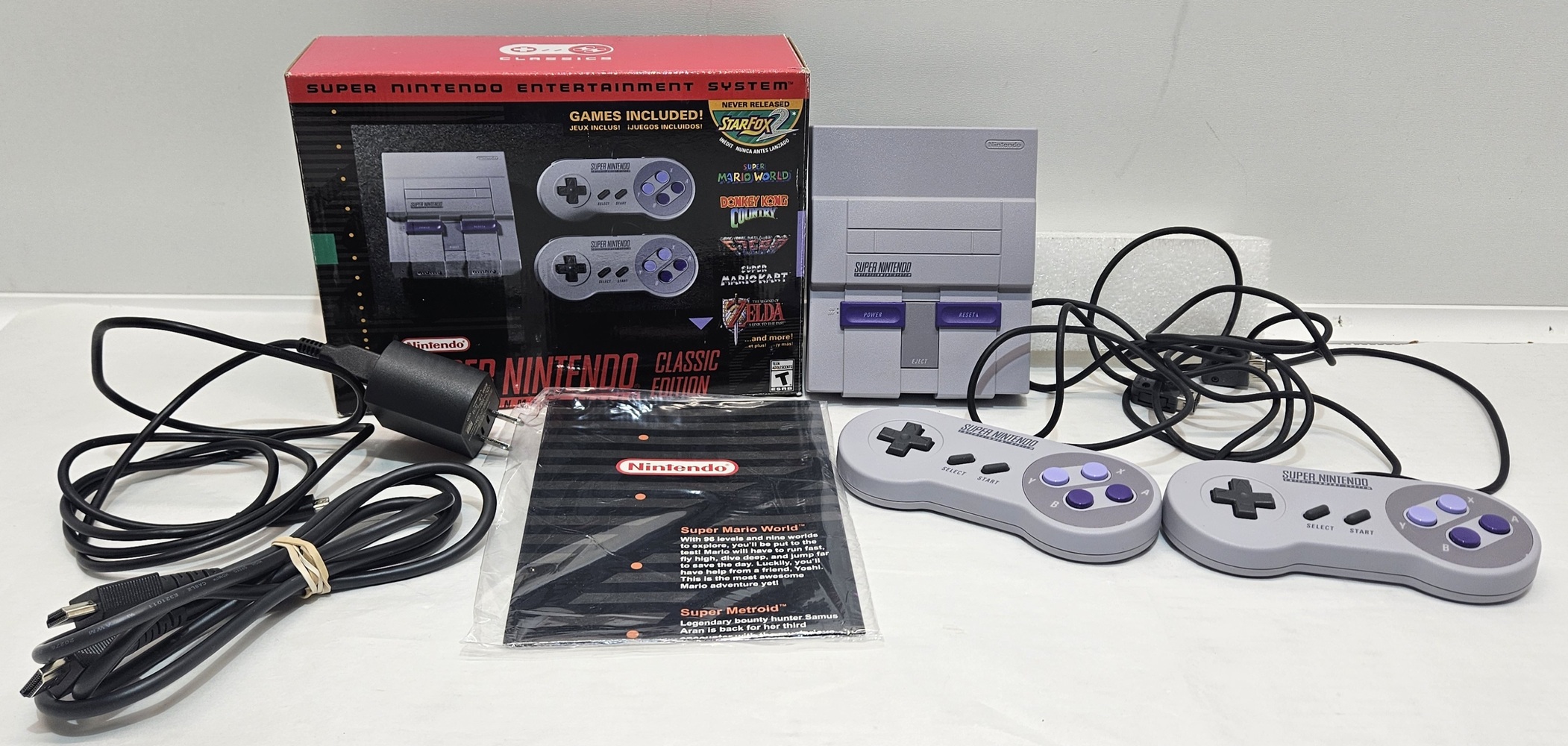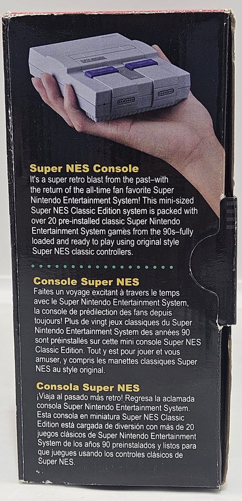 The Super NES Nintendo Mini Console Classic Edition is a home console manufactured by Nintendo in 2018. It features a gray color design and comes with 30 built-in games, offering a nostalgic gaming experience for users.