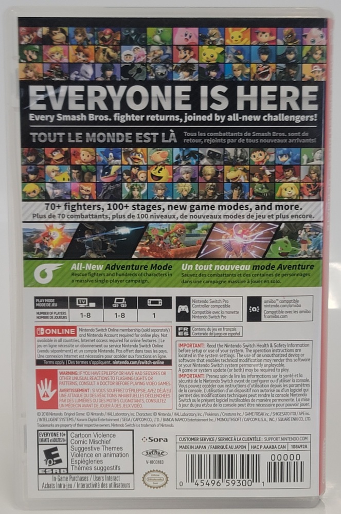 Super Smash Bros. Ultimate is a 2018 crossover fighting game developed by Bandai Namco Studios and Sora Ltd. and published by Nintendo for the Nintendo Switch. It is the fifth installment in the Super Smash Bros. series, succeeding Super Smash Bros. for Nintendo 3DS and Wii U. The game follows the series' traditional style of gameplay, in which players control one of the various characters and use attacks to weaken their opponents and knock them out of an arena. It features a wide variety of game modes, including a single-player campaign and multiplayer versus modes. Ultimate features 89 playable fighters, including all characters from previous Super Smash Bros. games as well as newcomers. The roster ranges from Nintendo characters to those from third-party franchises.