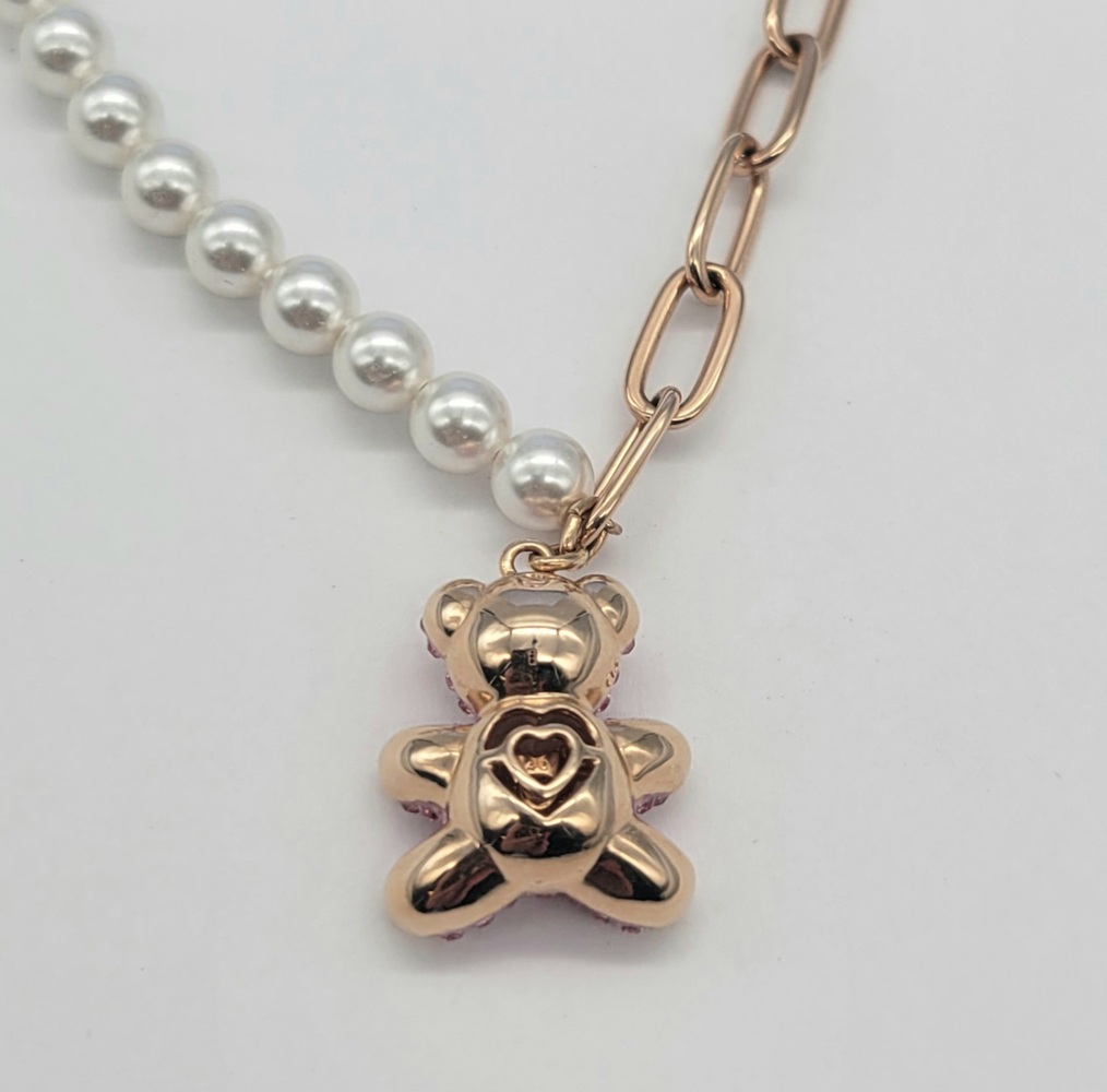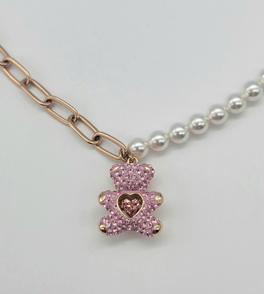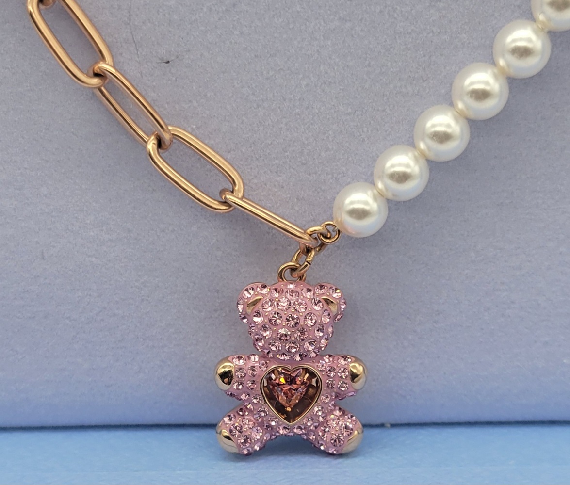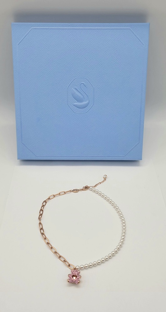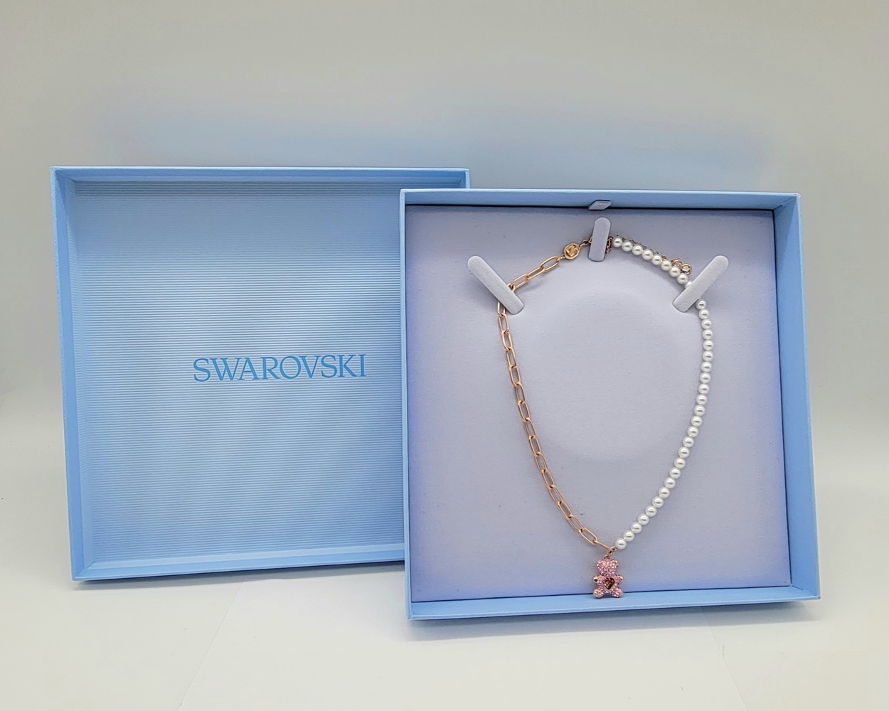 Unwrap elegance with a Swarovski 18k Rose Gold Plated Pink Crystal Teddy Bear Necklace. This unparalleled piece, gleaming in rosy allure and precious pink crystal sparkles, bears beauty and charm. Presented in a refined box, it's a whimsical touch for your style story. Limited edition magic, enjoy yours while it lasts!
