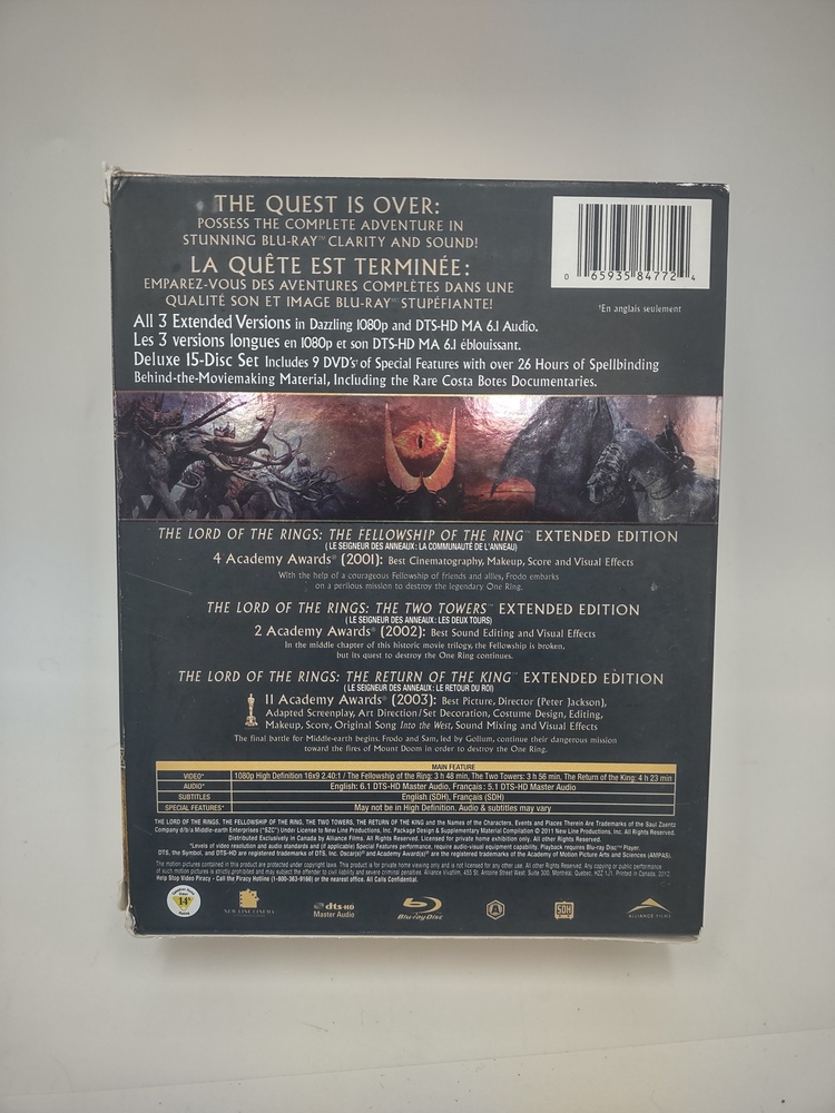This deluxe 15-disc set includes all three extended versions of the movie in Blu-Ray and 9 DVDs of special features with over 26 hours of spellbinding behind-the-moviemaking material, including the rare Costa Botes documentaries!! There is some damage to the corners of the sleeve, but the discs are in mint condition.
