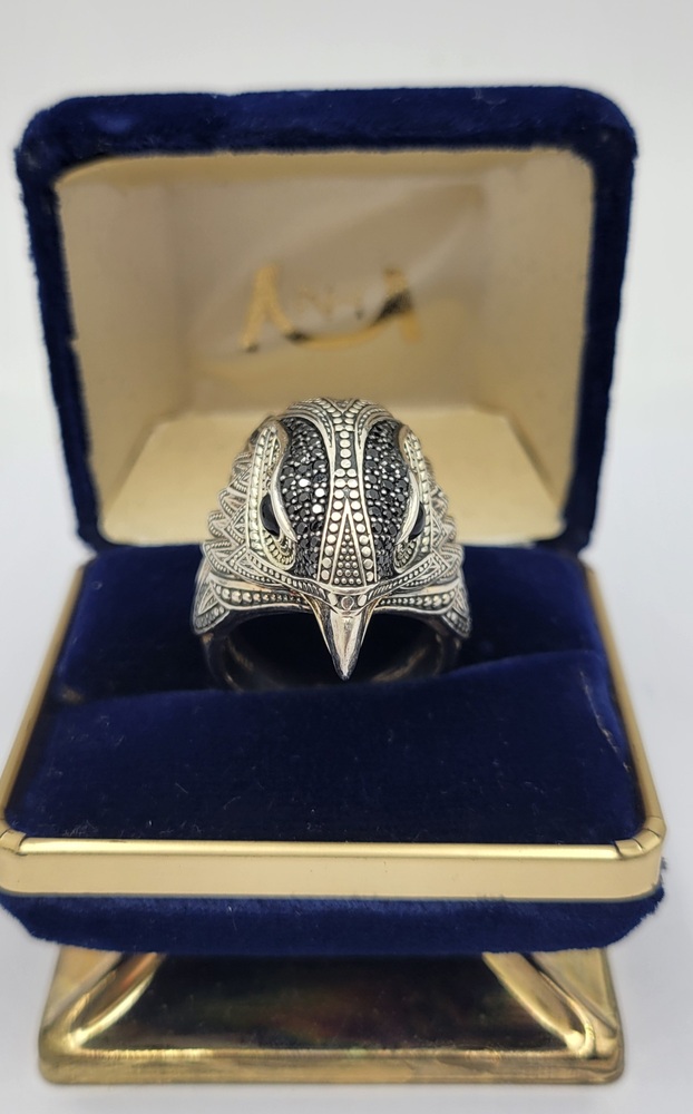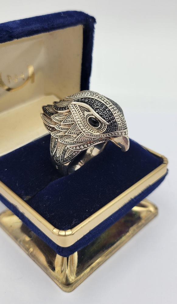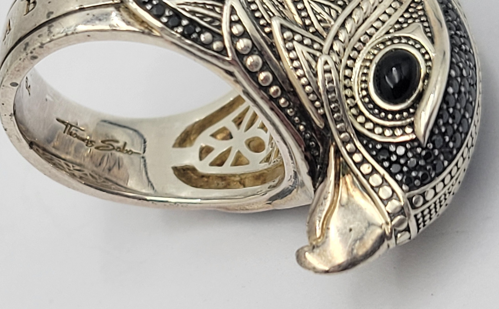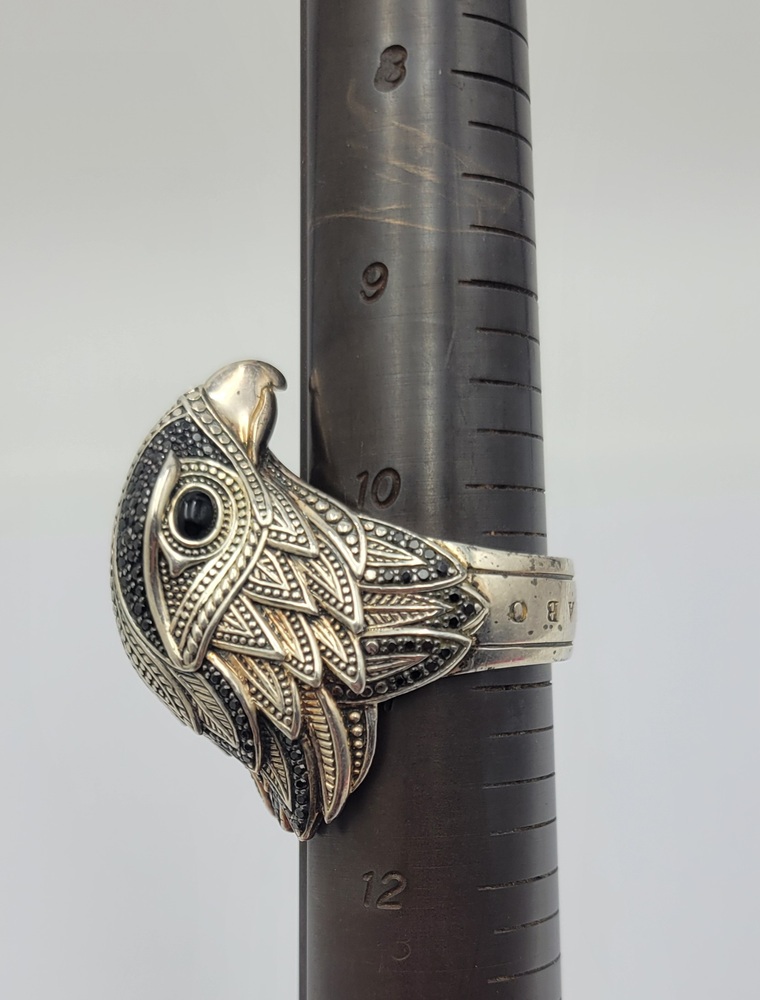 Unleash your fierce charisma with Thomas Sabo's sterling silver Falcon Ring. Majestic in size 10.25, this unique piece boasts onyx-inlaid eyes and glitters with bold black zirconia stones. Captivate and command in this limited-edition symbol of power and freedom.