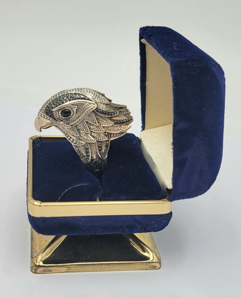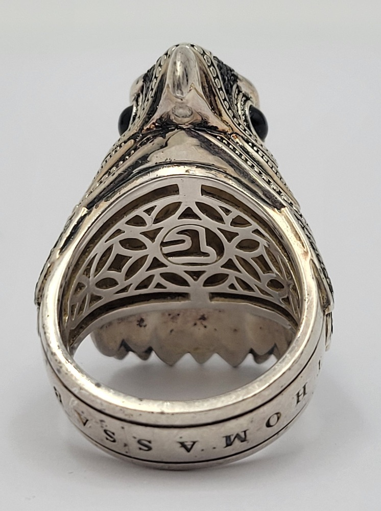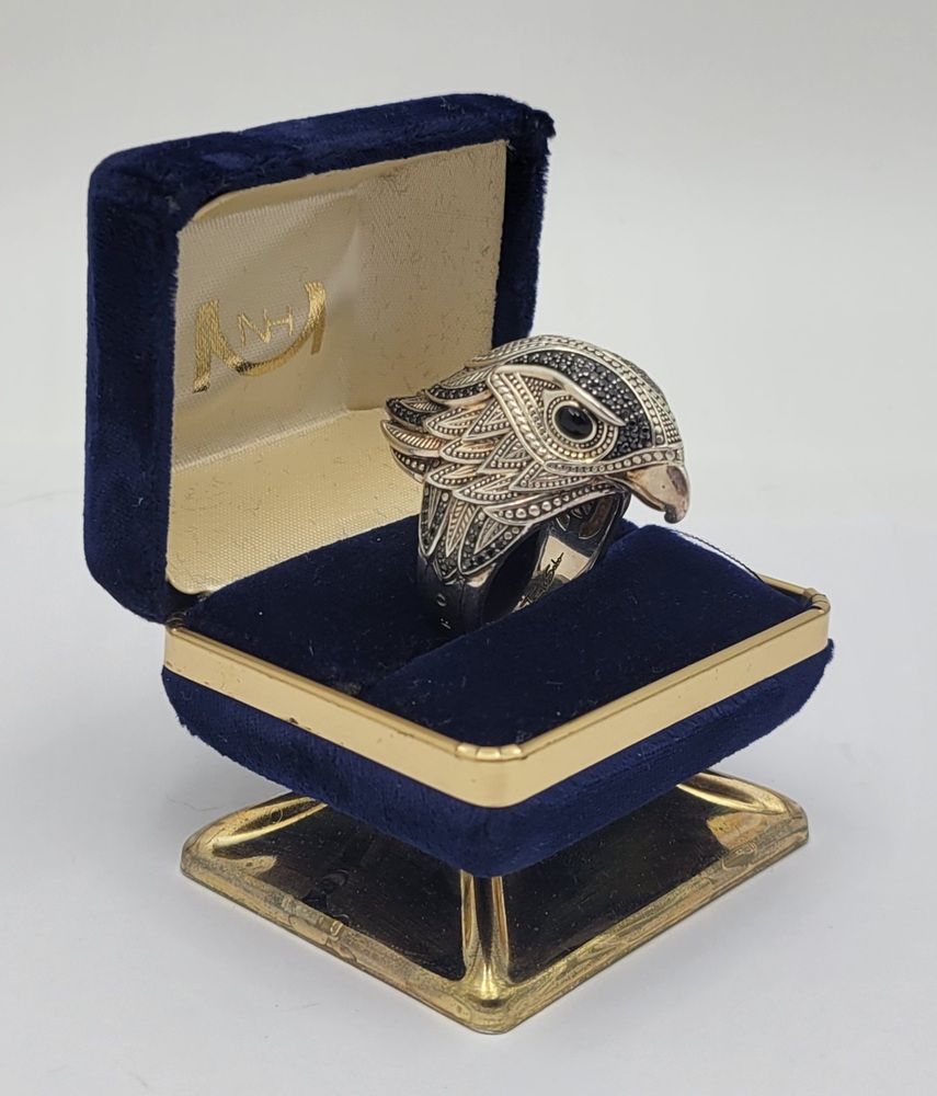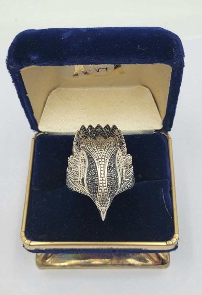 Unleash your fierce charisma with Thomas Sabo's sterling silver Falcon Ring. Majestic in size 10.25, this unique piece boasts onyx-inlaid eyes and glitters with bold black zirconia stones. Captivate and command in this limited-edition symbol of power and freedom.