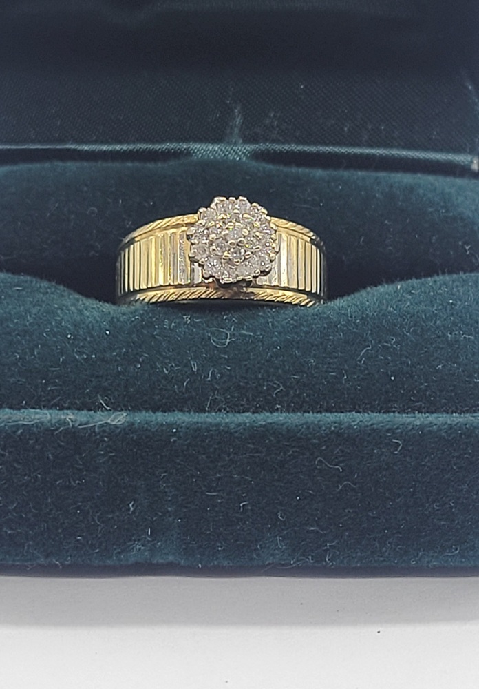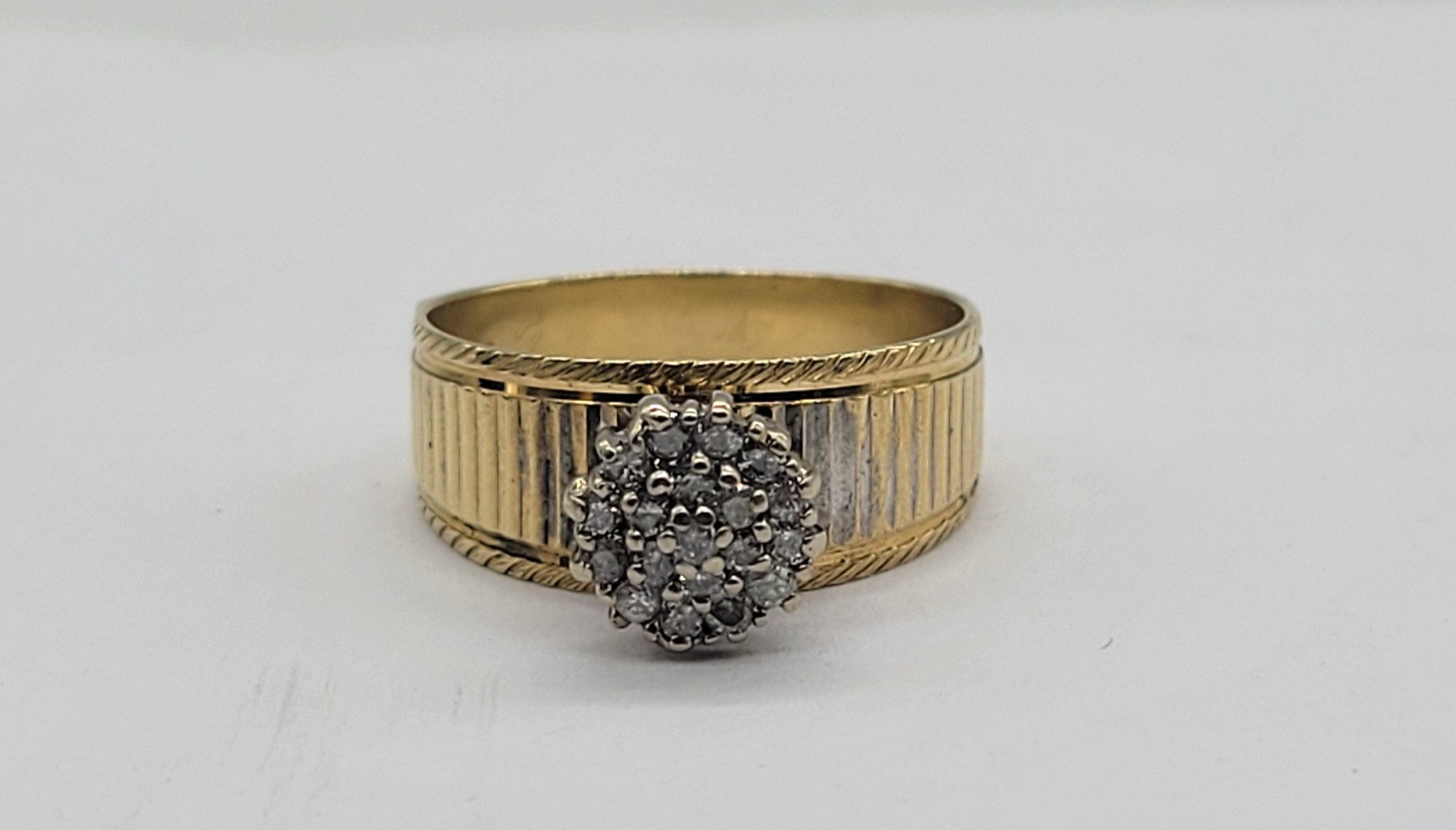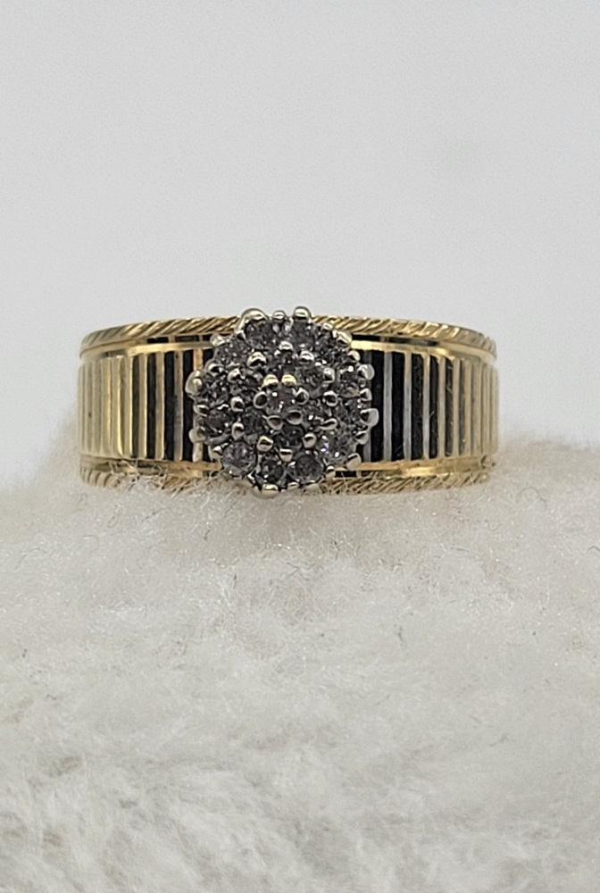 Step back in time with this exquisite Vintage 10k Two Tone Gold & Diamond Cluster Ring. Encrusted with approximately 0.09 t.c.w. of shimmering diamonds, this Size 7 stunner marries timeless charm and starry brilliance. Perfect for those who adore a touch of historical romance in their jewels!