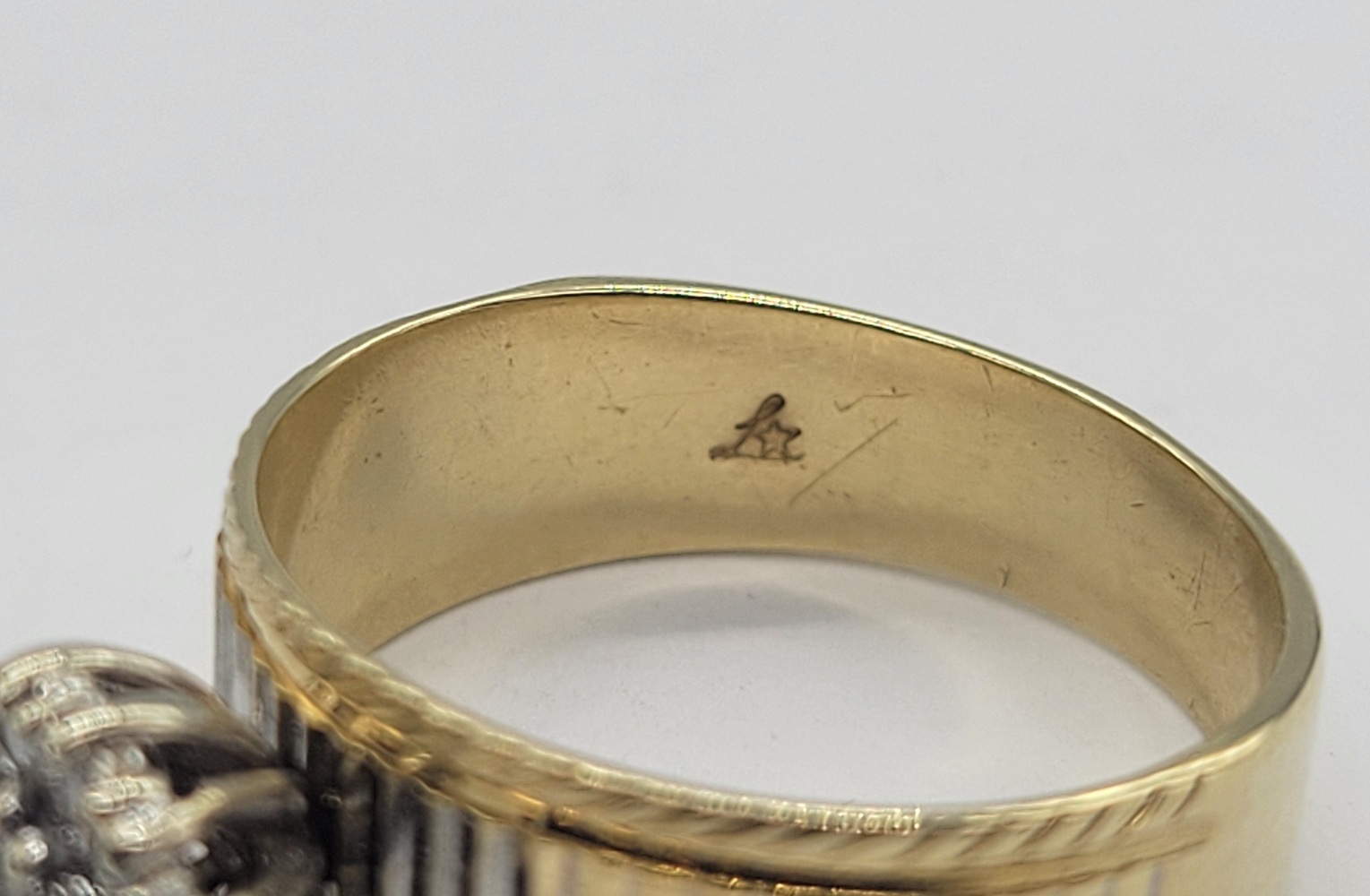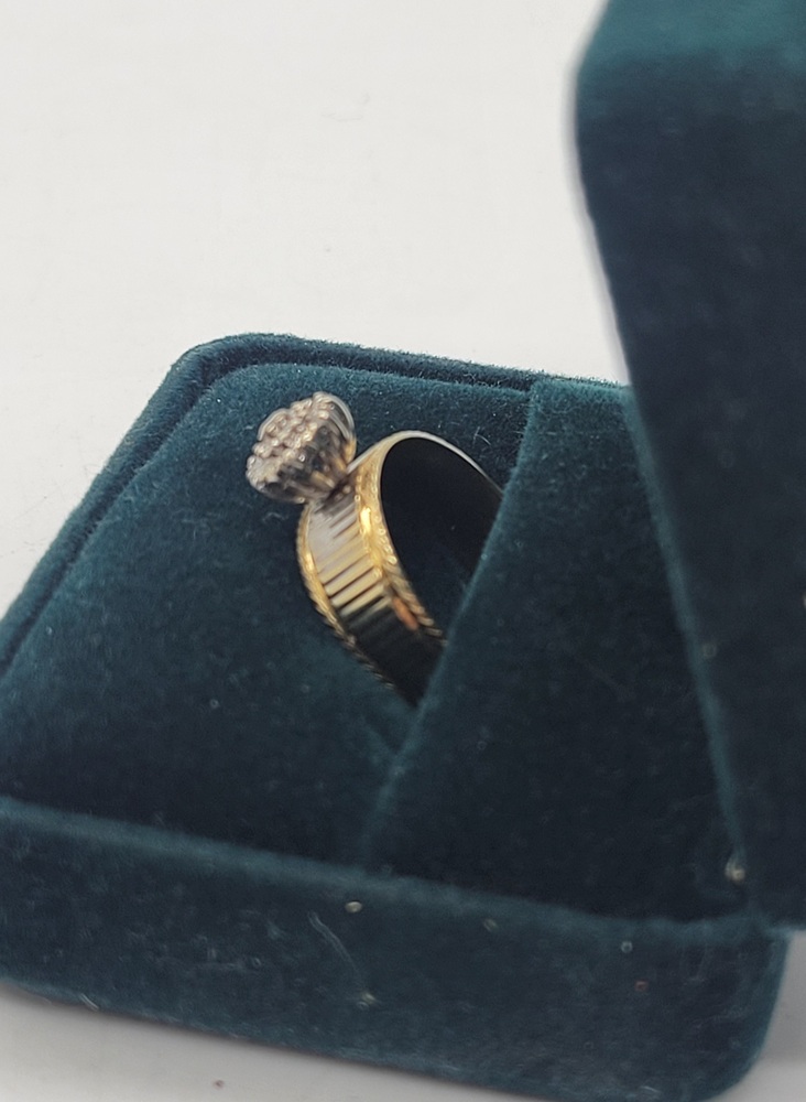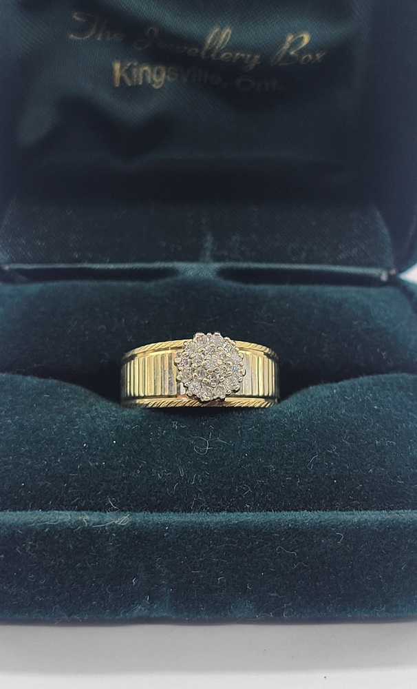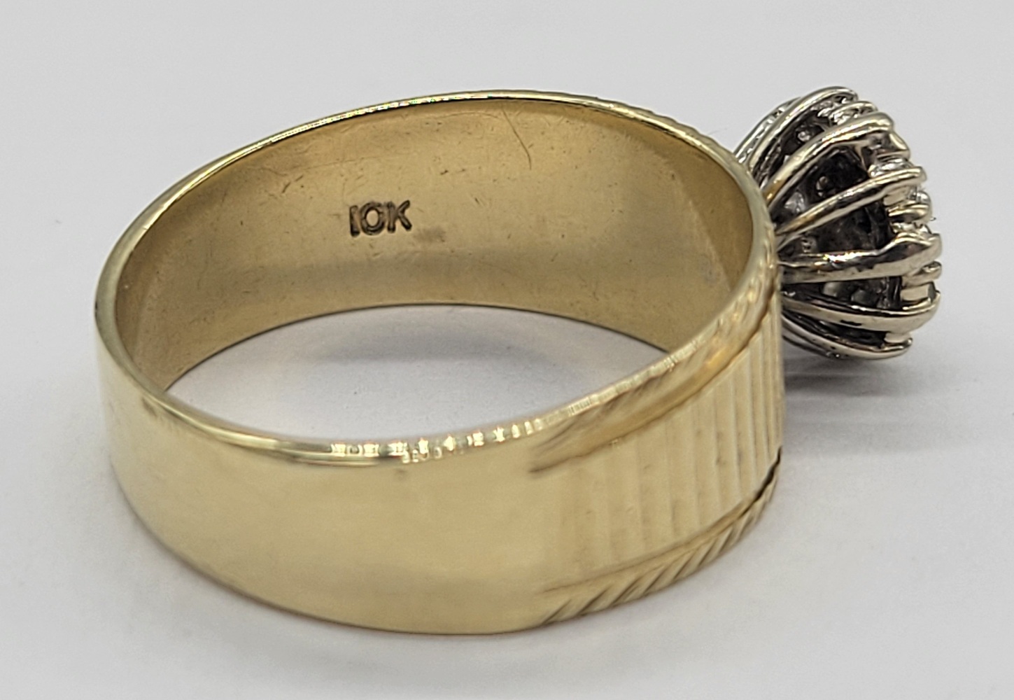 Step back in time with this exquisite Vintage 10k Two Tone Gold & Diamond Cluster Ring. Encrusted with approximately 0.09 t.c.w. of shimmering diamonds, this Size 7 stunner marries timeless charm and starry brilliance. Perfect for those who adore a touch of historical romance in their jewels!