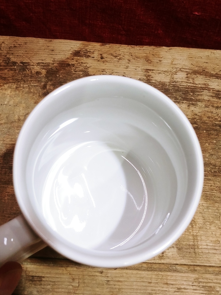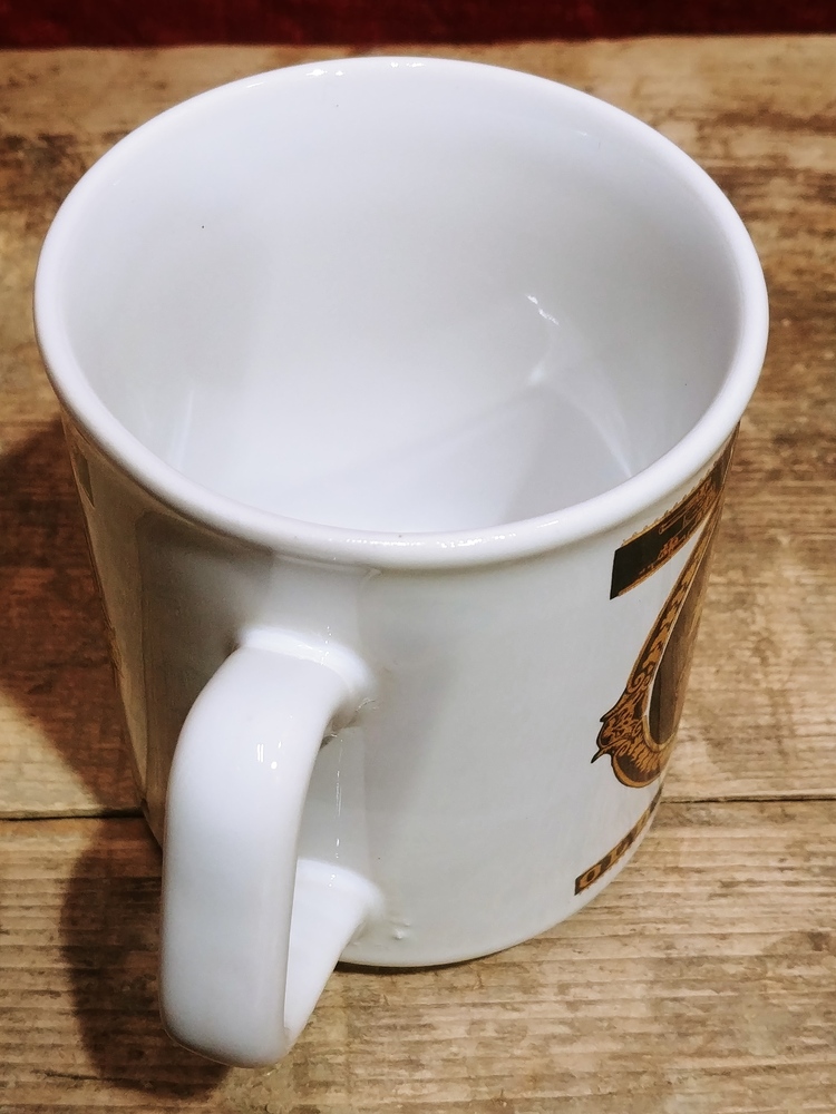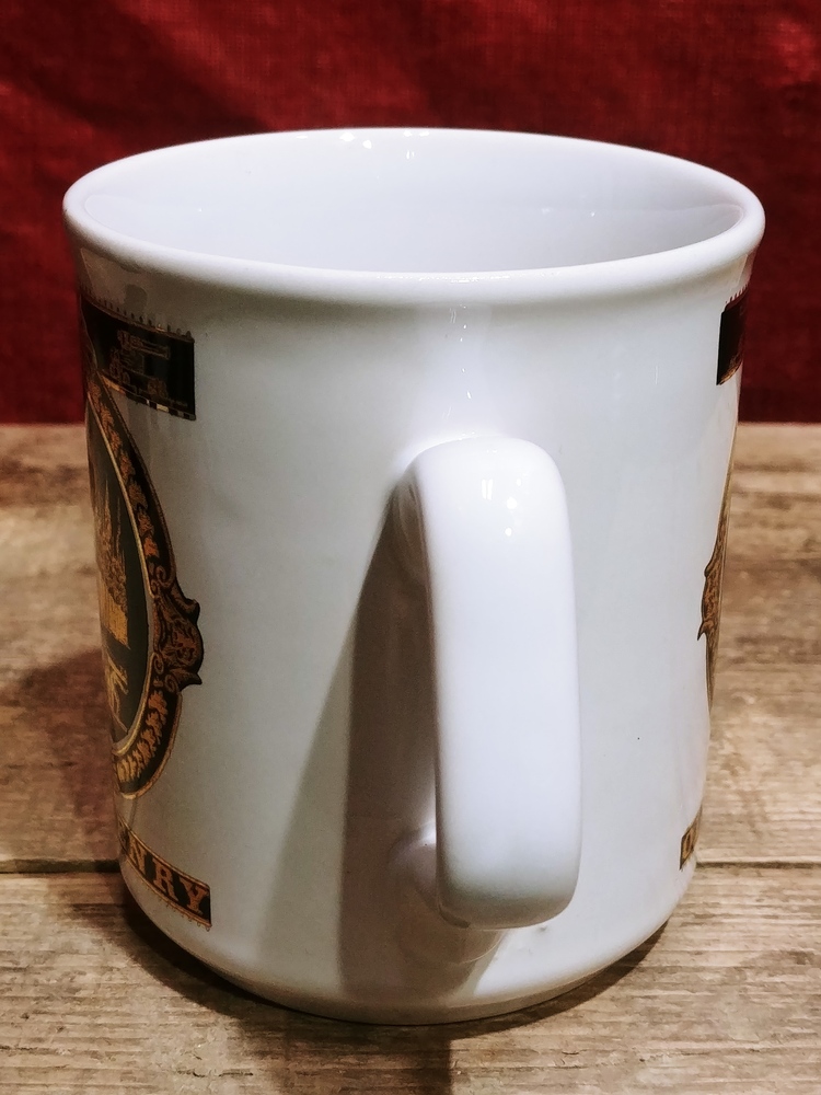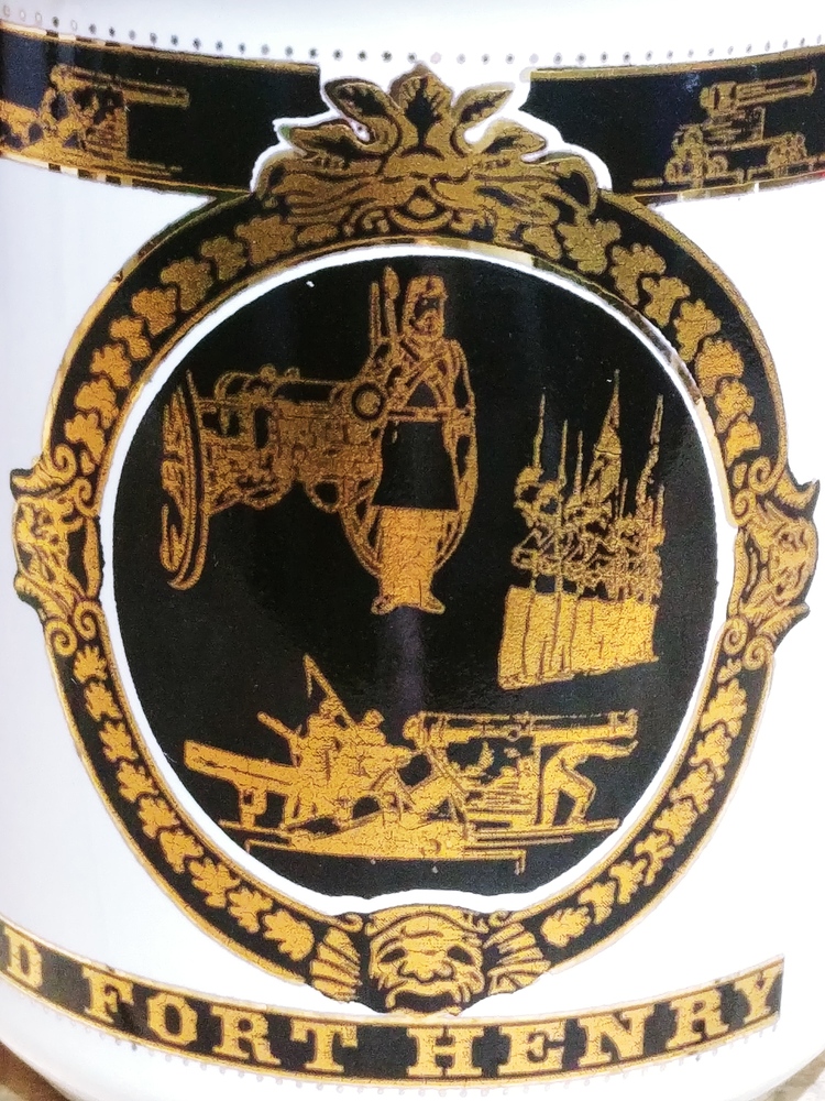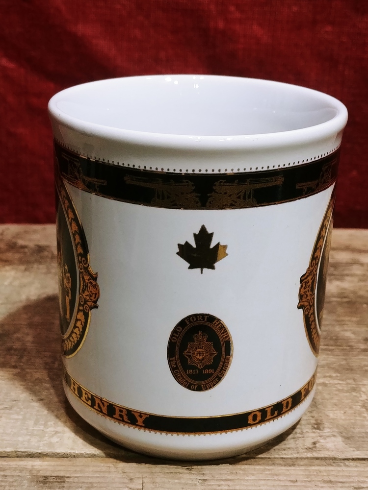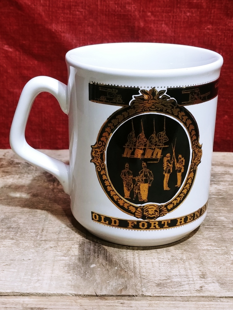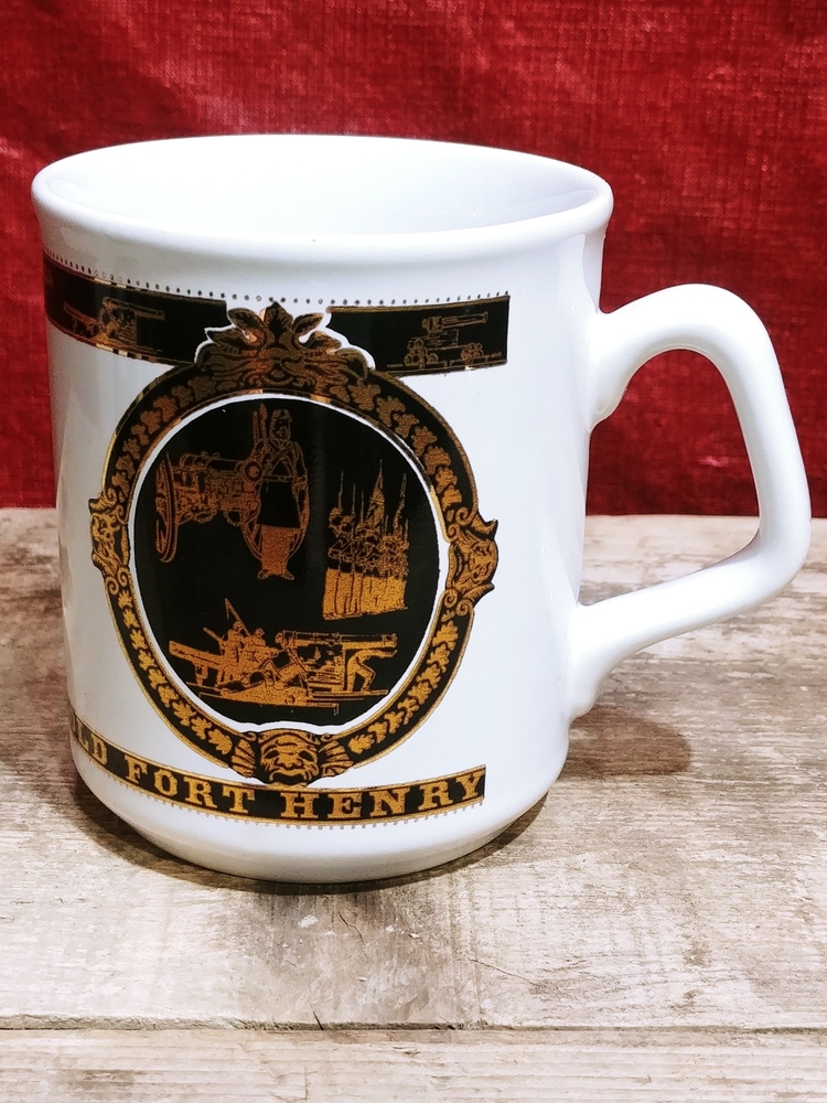This preowned VTG ceramic mug is decorated with images in black and gold of Old Fort Henry. It is free from chips or cracks and measures 3 5/8 in (9cm) tall and 3 in (8cm) wide across its opening.