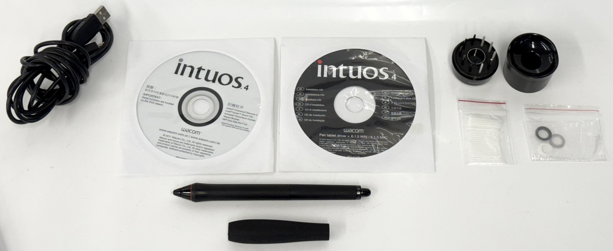 This listing includes the drawing tablet, storage case, pen, pen grip, USB cord, extra pen tips, and 2 driver discs.