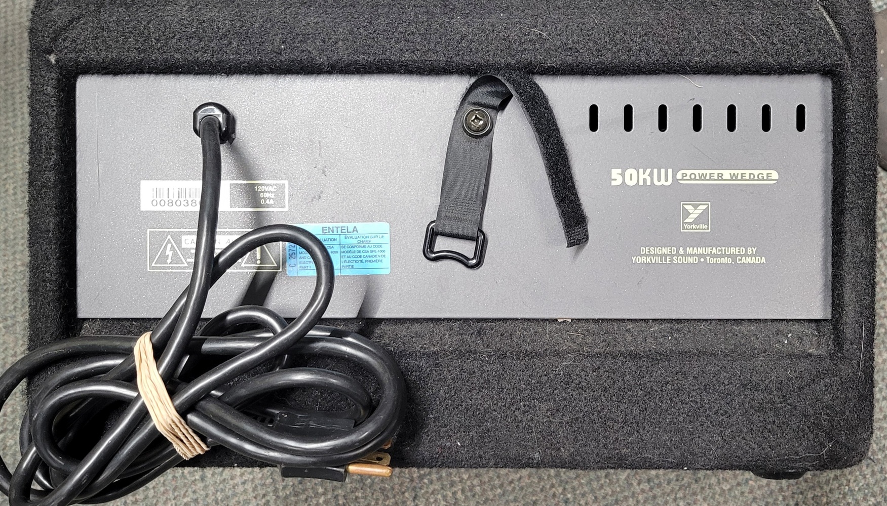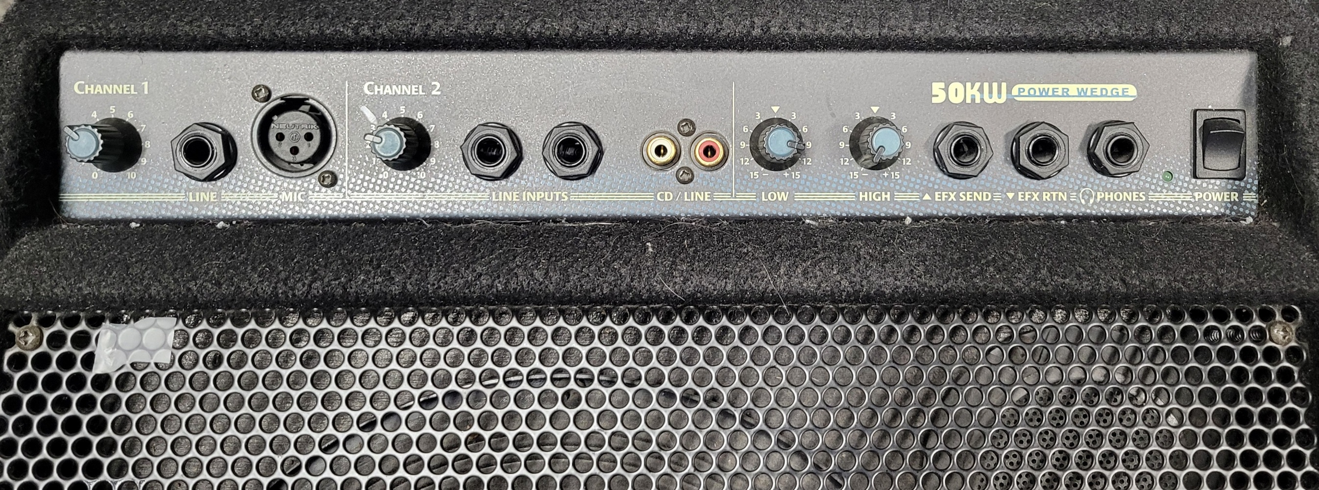 Solid plywood cabinet construction, black carpet covering, curved perforated all-metal grille and a recessed control panel ensure the 50KW will perform flawlessly night after night.